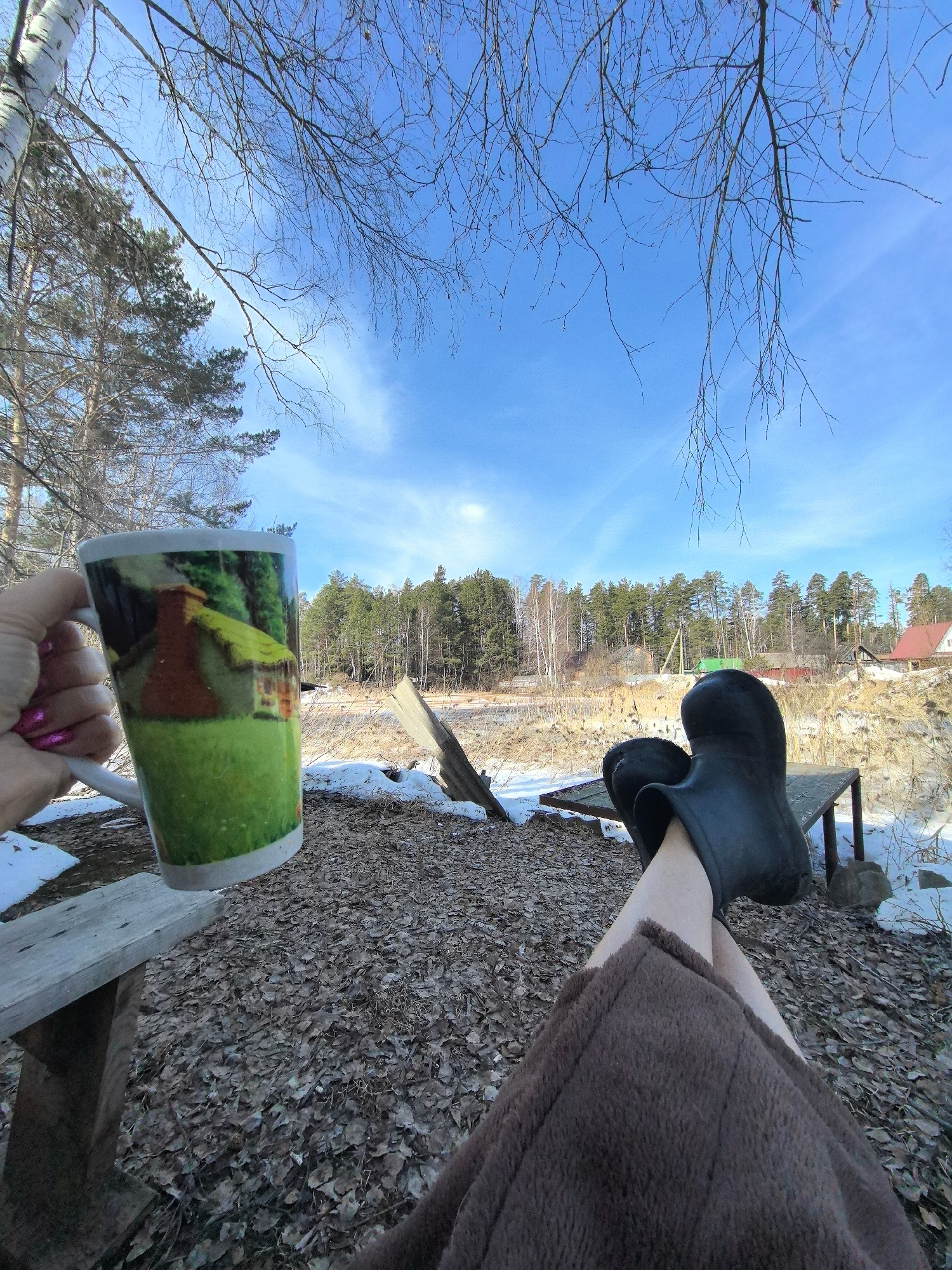 The image depicts a person relaxing outdoors, possibly in the vicinity of Noviy, Russia, suggested by the landscape and vegetation. The person is seated, legs extended onto a low table, wearing black…read more