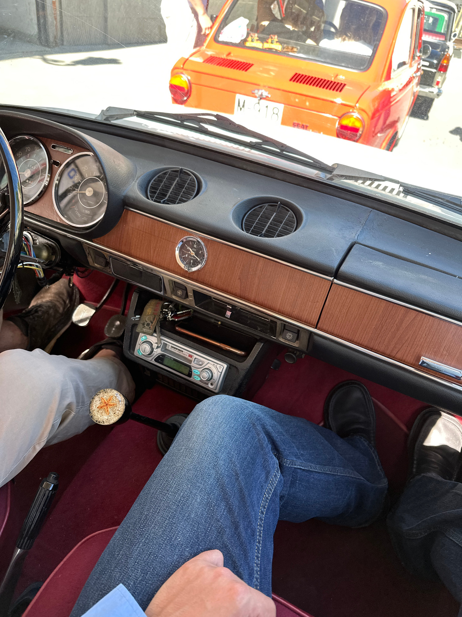The image shows the interior of a classic car, likely taken from the driver's perspective. The dashboard is visible, featuring a wooden trim, air vents, gauges, a clock, and a modern-looking car radioβ¦read more