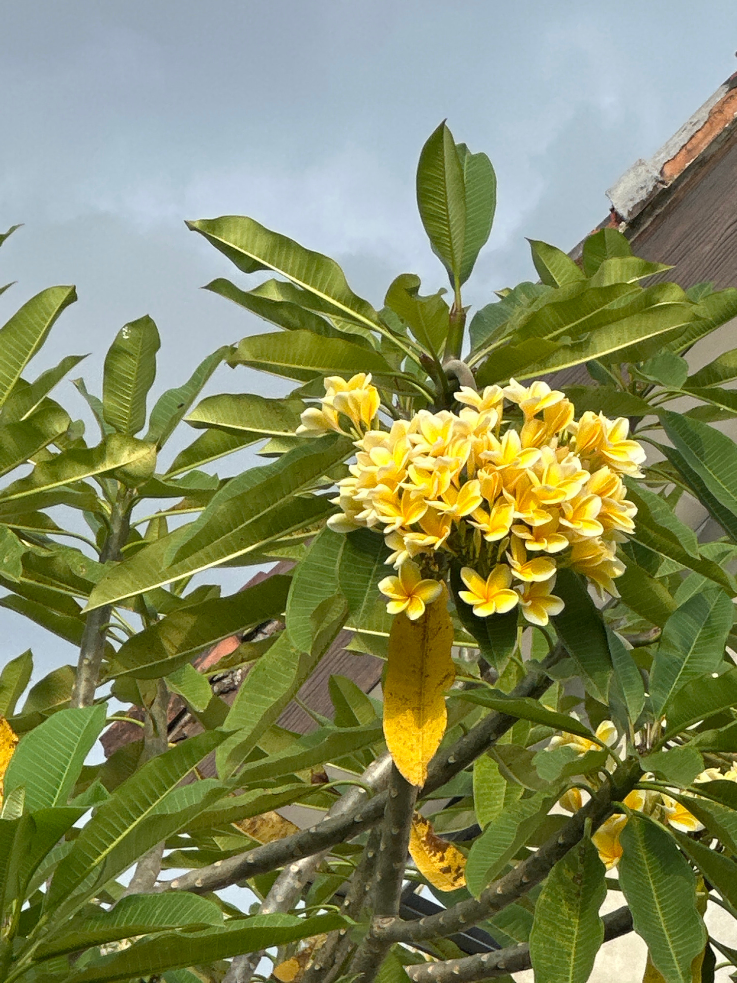 An upward-angled photograph depicts a vibrant cluster of yellow Frangipani (Plumeria) flowers, surrounded by numerous green leaves and visible branches of the tree, situated in Buduk, Indonesia. The f…read more