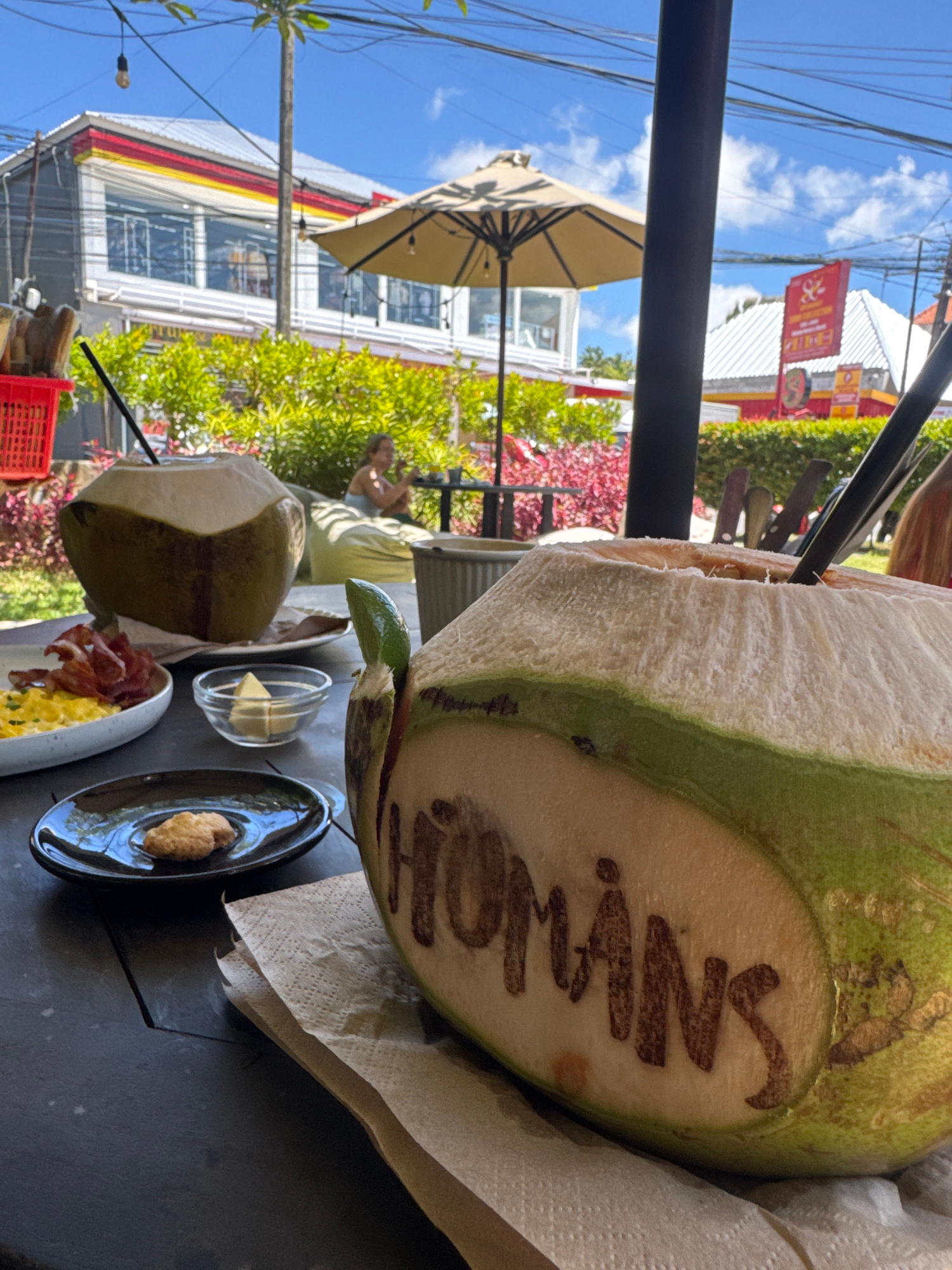 From a high-angle perspective, the image captures a culinary scene at a location in Ungasan, Indonesia. The foreground is dominated by a table setting that includes food and drinks. A partially opened…read more