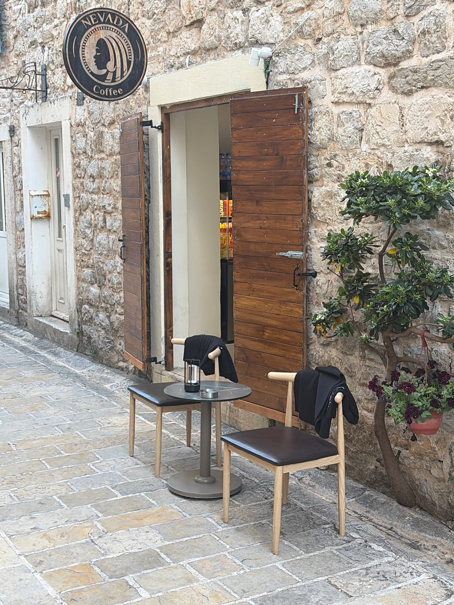 The image shows the exterior of Nevada Coffee in Budva, Montenegro. The building has a stone facade with a wooden door and a small window. A black jacket and a drum are placed on the chair. A small ta…read more