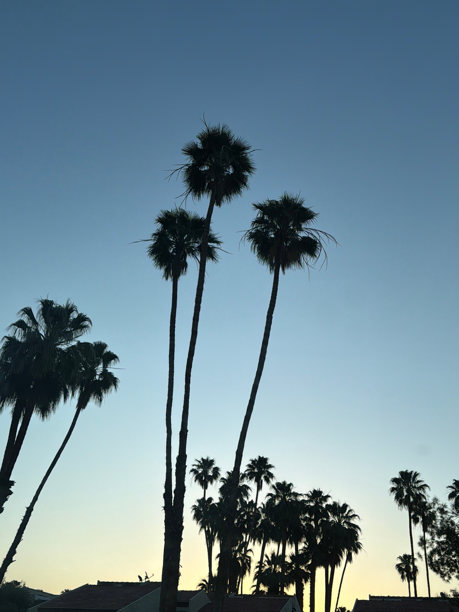 The image presents a serene outdoor scene, strongly suggesting either a sunrise or sunset in Palm Springs, United States of America. The sky displays a striking gradient, transitioning from a deep blu…read more