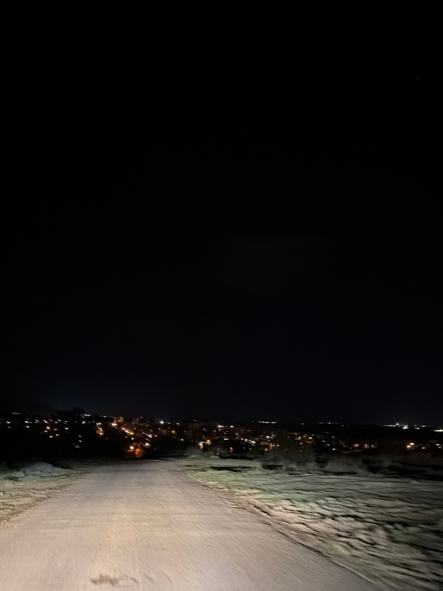 The image depicts a nighttime scene. On the right, a road or paved surface is visible, illuminated by a light source, likely headlights. To the left of the road appears to be a grassy or natural terra…read more