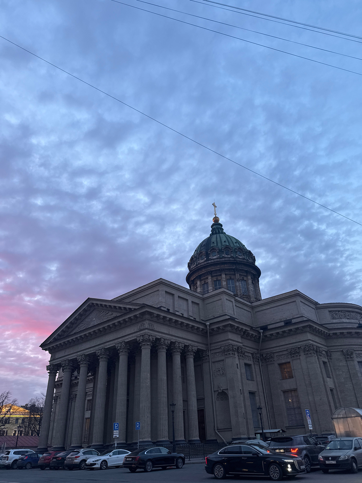 The image depicts the Kazan Cathedral in Saint Petersburg, Russia, from a low angle. The cathedral's dome and colonnade are visible against a cloudy, pink-tinged sky. Power lines stretch across the up…read more