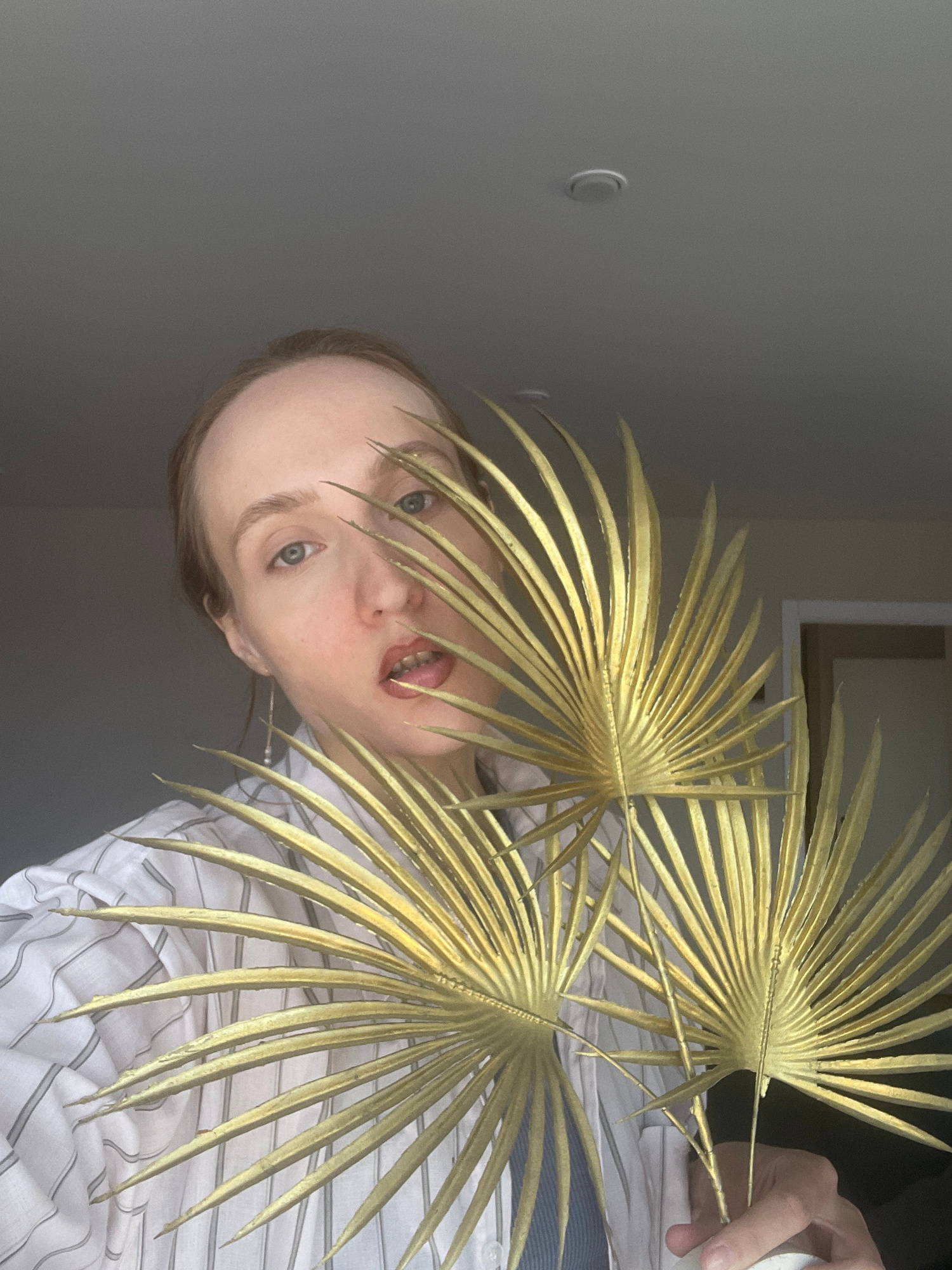 A fair-skinned person with blue eyes is looking into the camera behind two large golden palm fronds. The person is wearing a white and grey striped shirt. The background is a light grey wall with a ci…read more