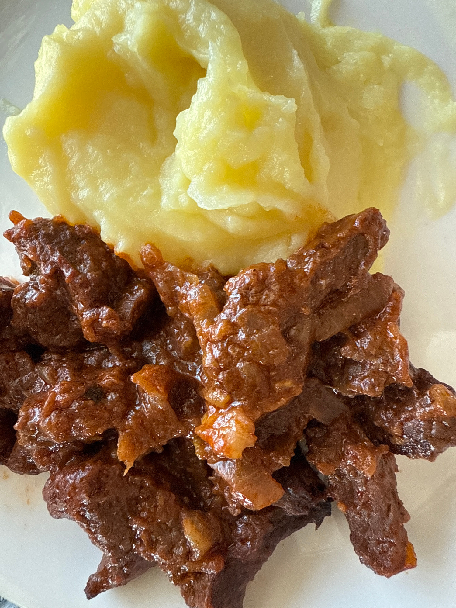 An overhead, close-up shot captures a serving of food on a white plate. The plate is divided almost vertically by two distinct food items. On the left side of the frame is a portion of mashed potatoes. They are a pale yellow color with a smooth, slightly lumpy texture, indicating a creamy consistency. The surface shows some gentle undulations and shadows, suggesting its soft form. Occupying the right side of the frame is a generous serving of dark brown, glossy meat. The meat appears to be stewed or braised, cut into irregular strips and chunks. It has a rich, deep brown hue, and the surface is shiny, likely from a savory sauce or gravy that coats it. The individual pieces of meat are piled together, creating a textured mound. The composition highlights the two main components of the meal, with the white plate providing a neutral background. There are no people visible, nor any specific activity beyond the presentation of the meal. No text is visible within the image. While the provided context indicates the location is Votkinsk, Russia, there are no visual cues within the image itself to confirm this. The lighting is bright and even, suggesting an indoor setting but giving no indication of the time of day or weather. | Open Wire