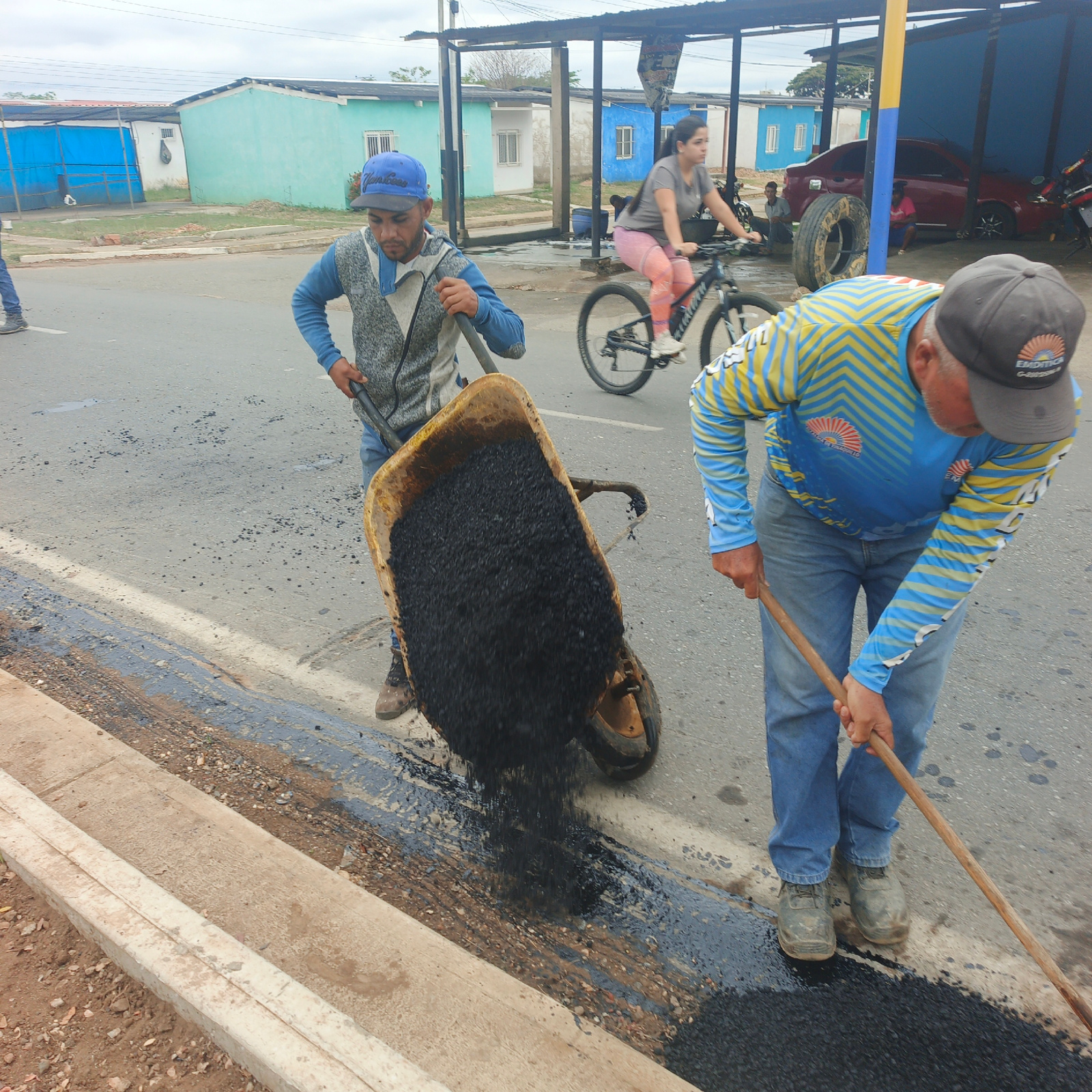 Two men are repairing a street in Tinaquillo, Venezuela. One man is tipping a wheelbarrow filled with asphalt onto the street, while the other is using a wooden tool to spread it. A woman on a bicycle…read more