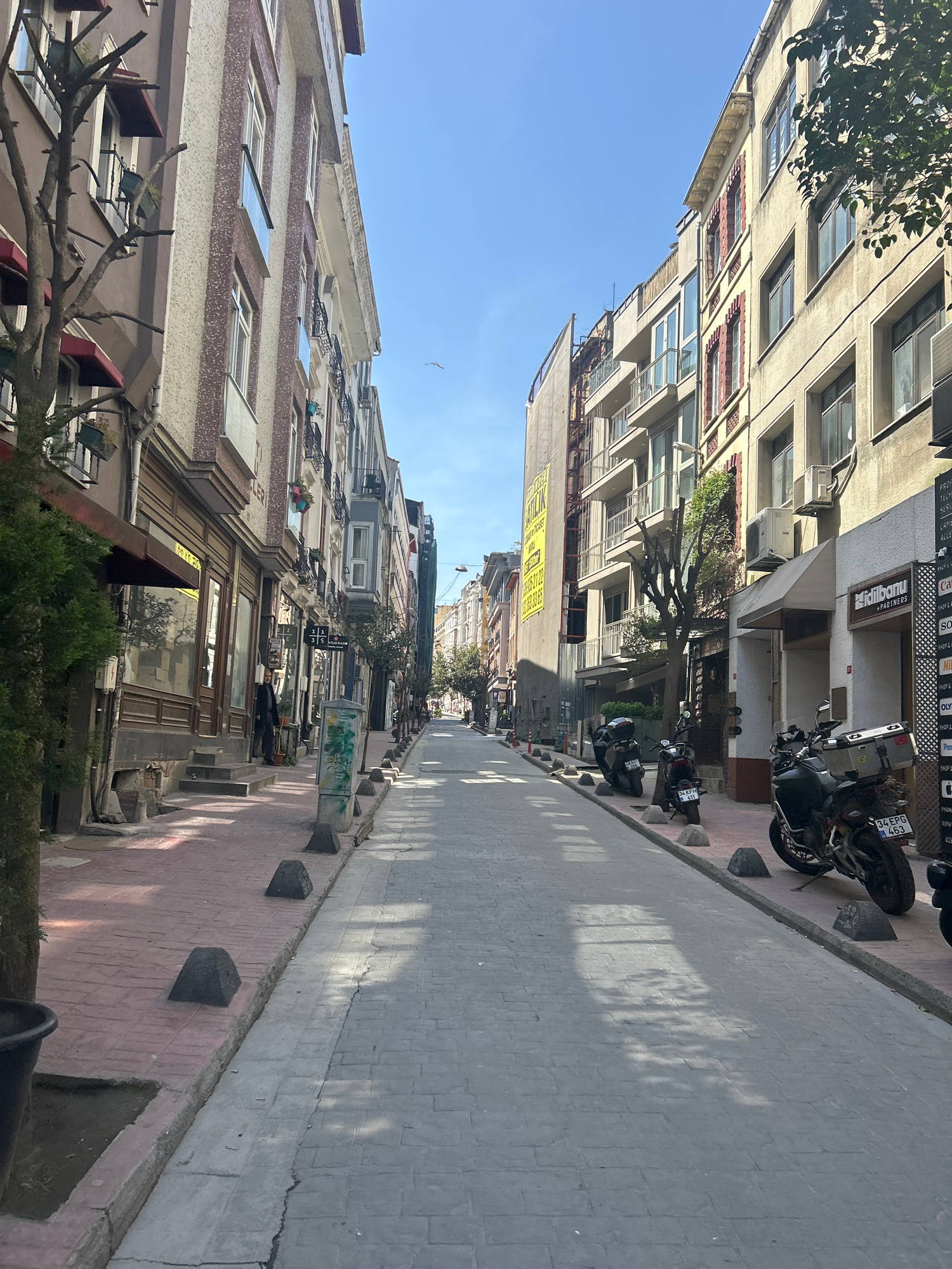 The image captures a street scene in Beyoğlu, Turkey, characterized by a narrow road lined with multi-story buildings on both sides. The buildings exhibit a variety of architectural styles with window…read more