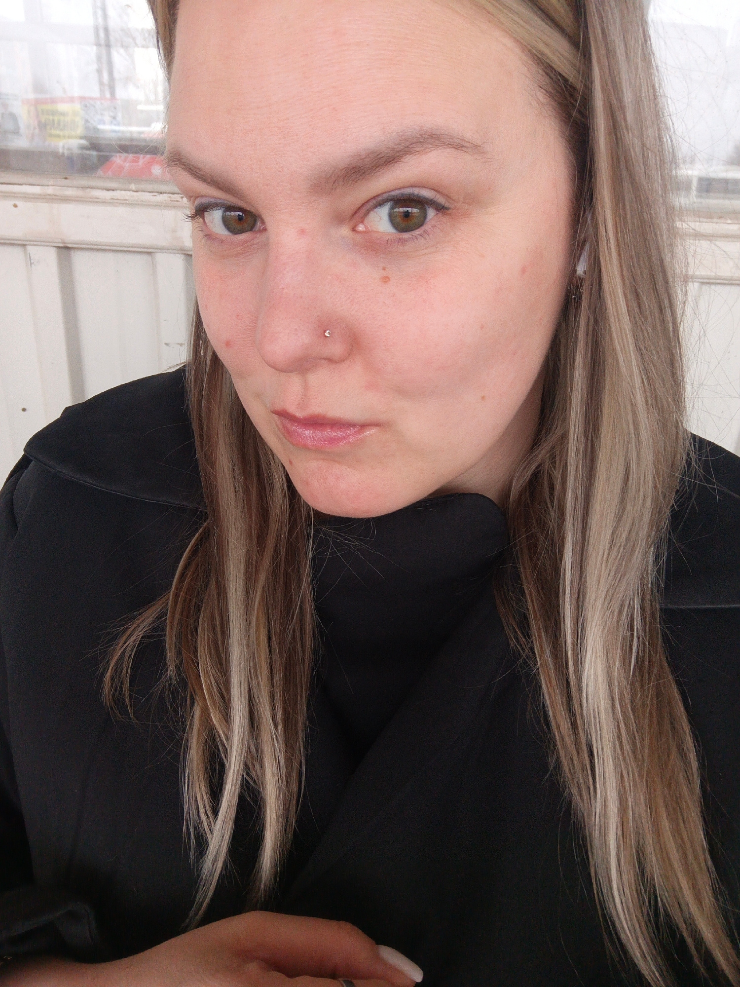 A woman with light brown and blonde highlighted hair is facing the camera. She has a nose piercing on her left nostril. She's wearing a black top. Her facial expression is a slight pursing of the lips…read more