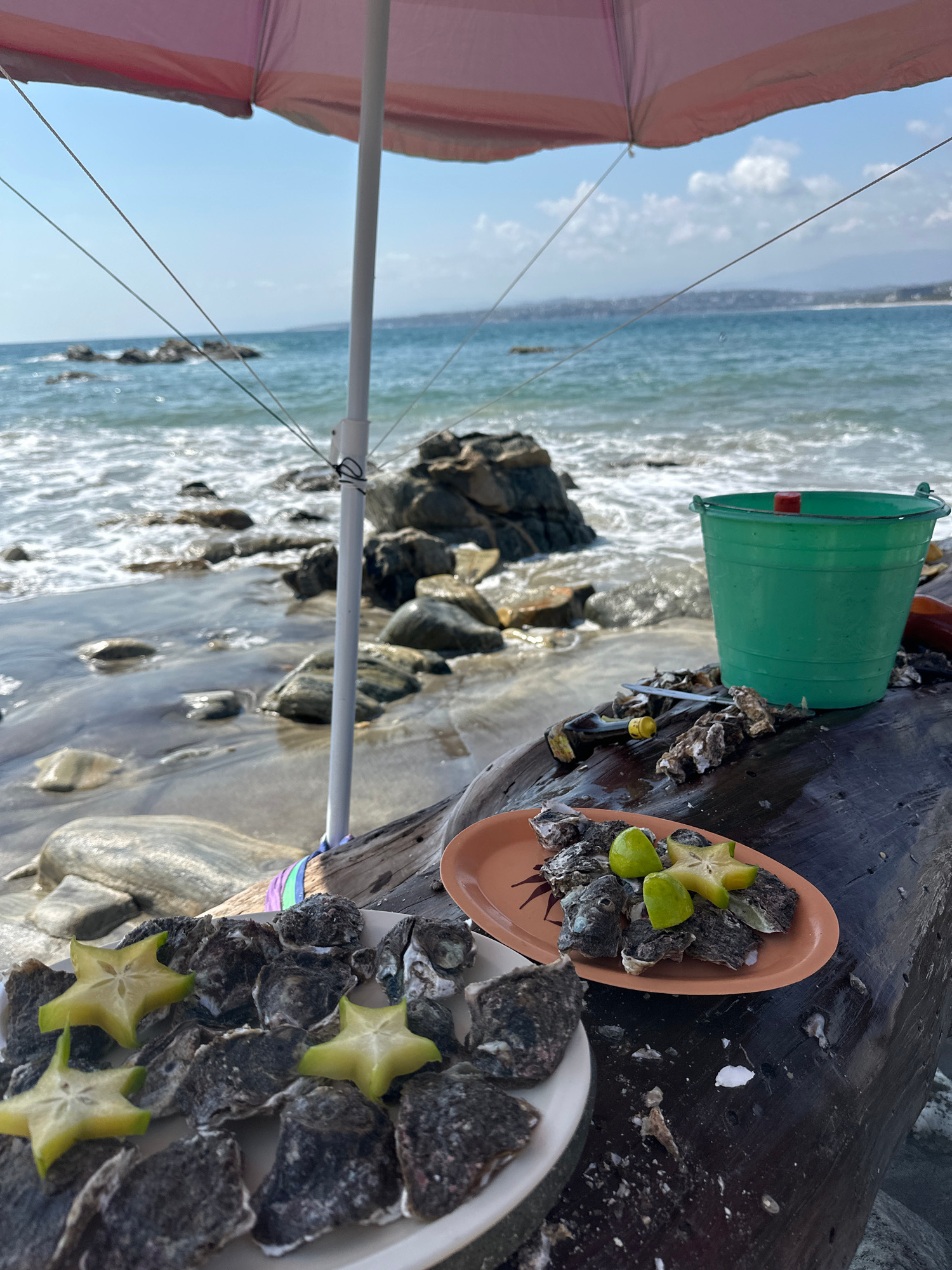 On a beach in Brisas de Zicatela, Mexico, two plates of oysters decorated with star fruit and limes are arranged on a weathered piece of driftwood near the ocean. A green bucket with a red handle sitsβ¦read more
