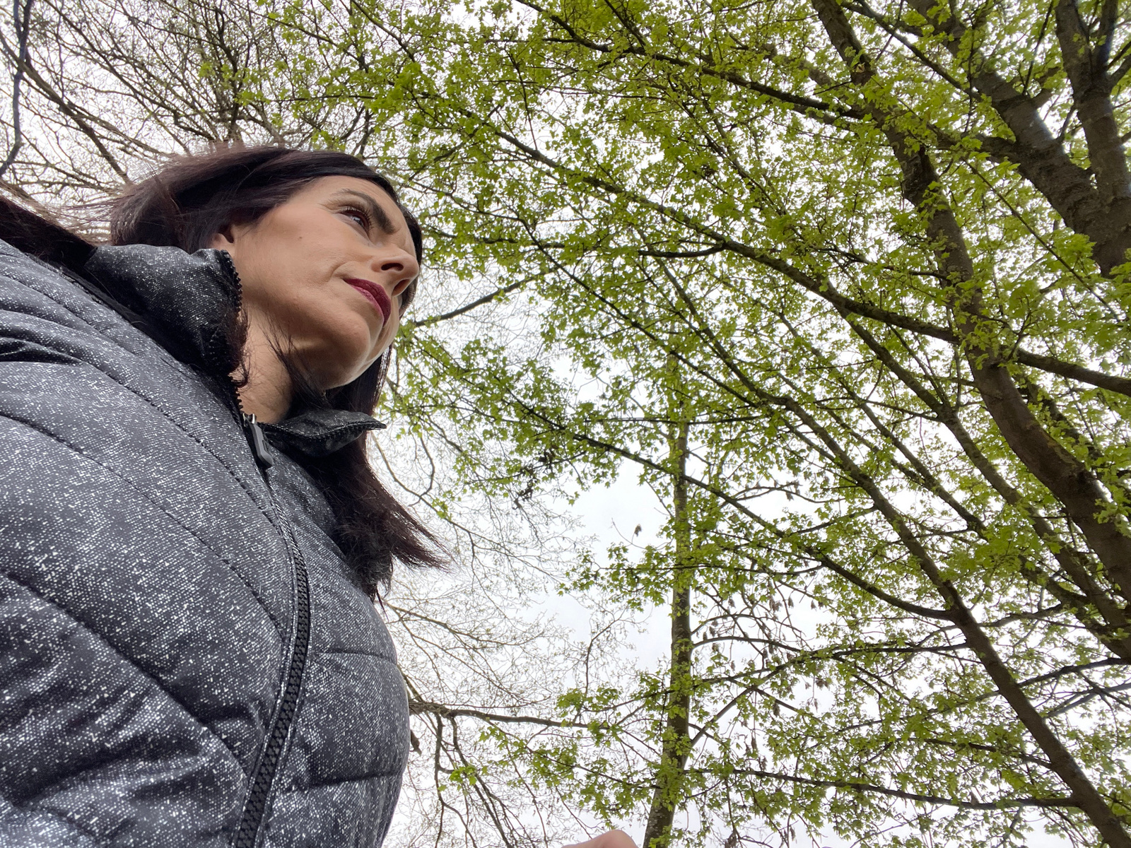 A low-angle shot captures a woman standing beneath trees with budding green leaves against an overcast sky. She is dressed in a gray jacket. The image is likely taken outdoors, possibly in a wooded ar…read more