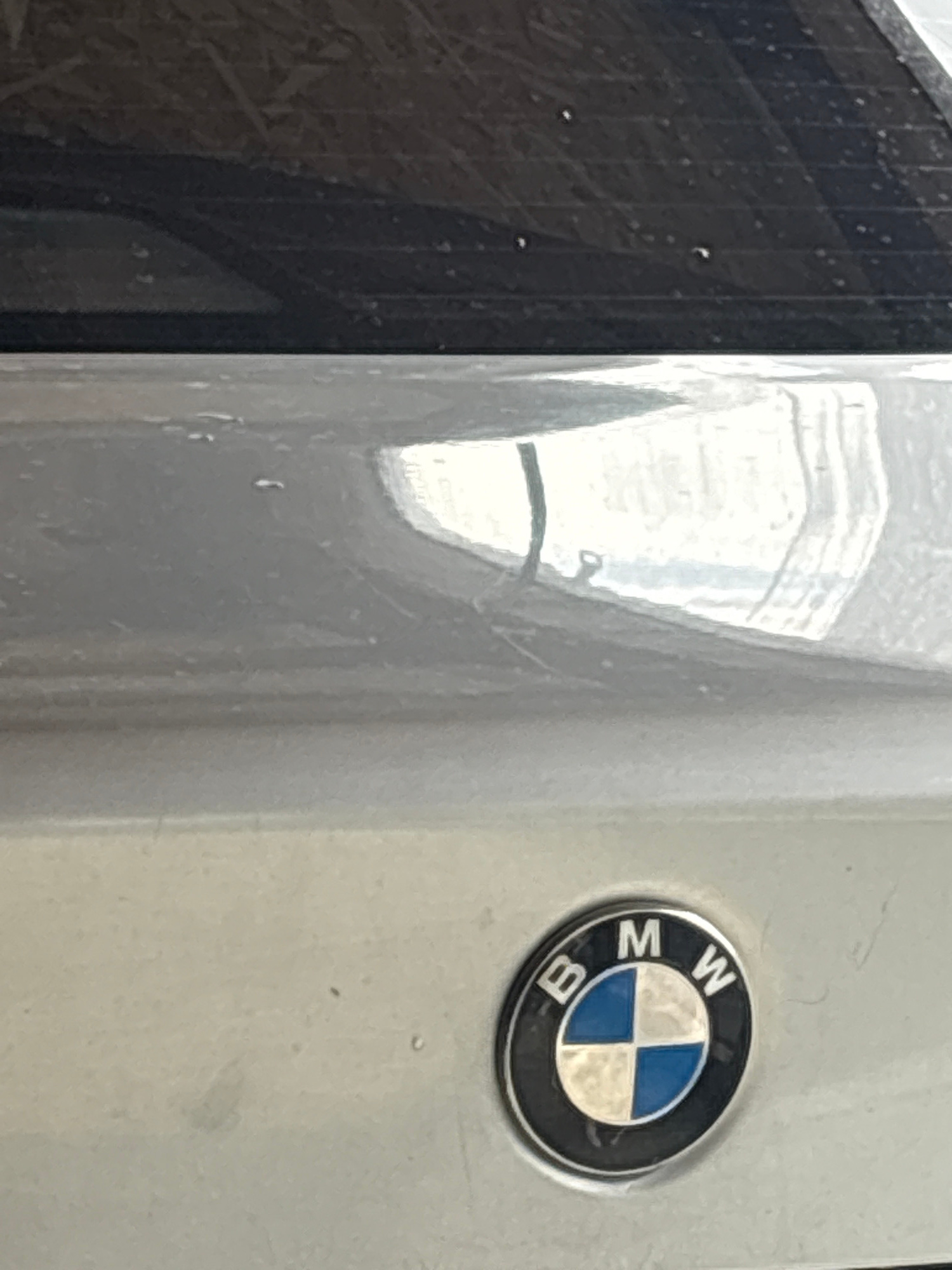 The image shows a close-up of a BMW car, specifically the logo, on a light-colored panel. The logo is circular, with the letters "BMW" and a blue and white checkered pattern inside. To the left of the…read more
