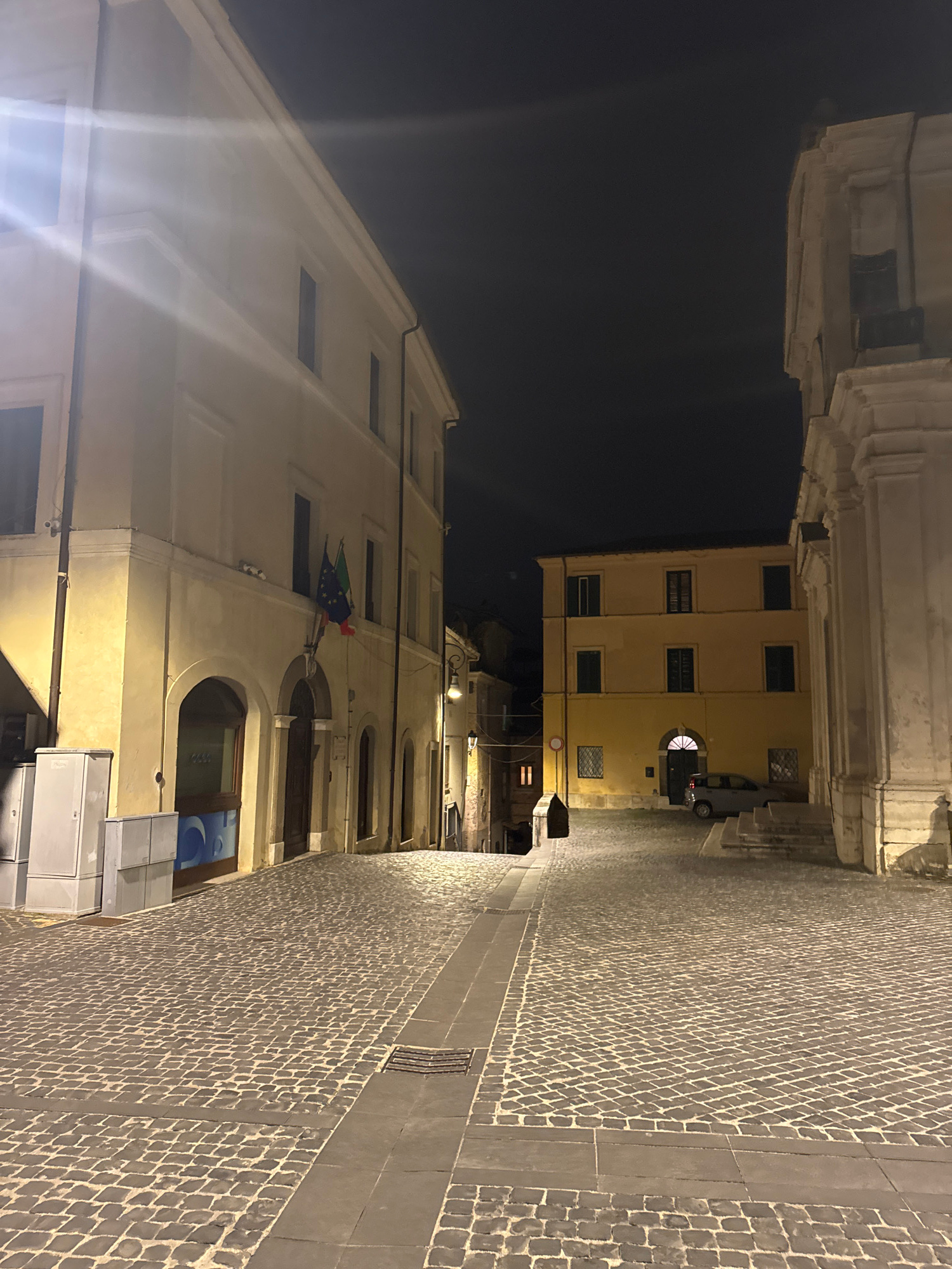 The image depicts a narrow street scene at night in Castelnuovo di Porto, Italy. The street is paved with cobblestones in a patterned design. Buildings flank both sides of the street, illuminated by d…read more