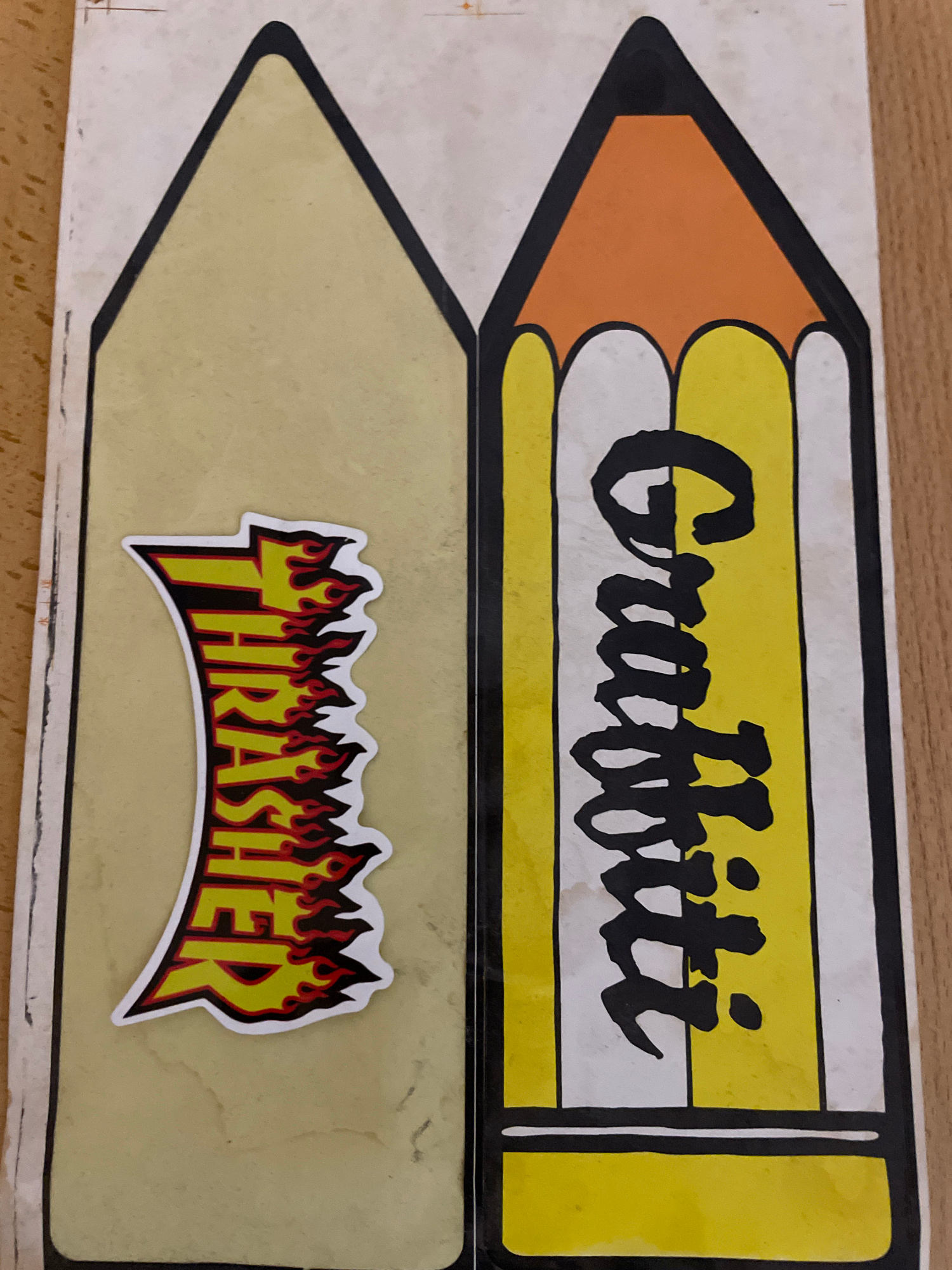 The image shows two rectangular stickers that resemble pencils. The top sticker is orange at the tip, with alternating yellow and white sections, and has the word "Graffiti" written in black cursive.…read more