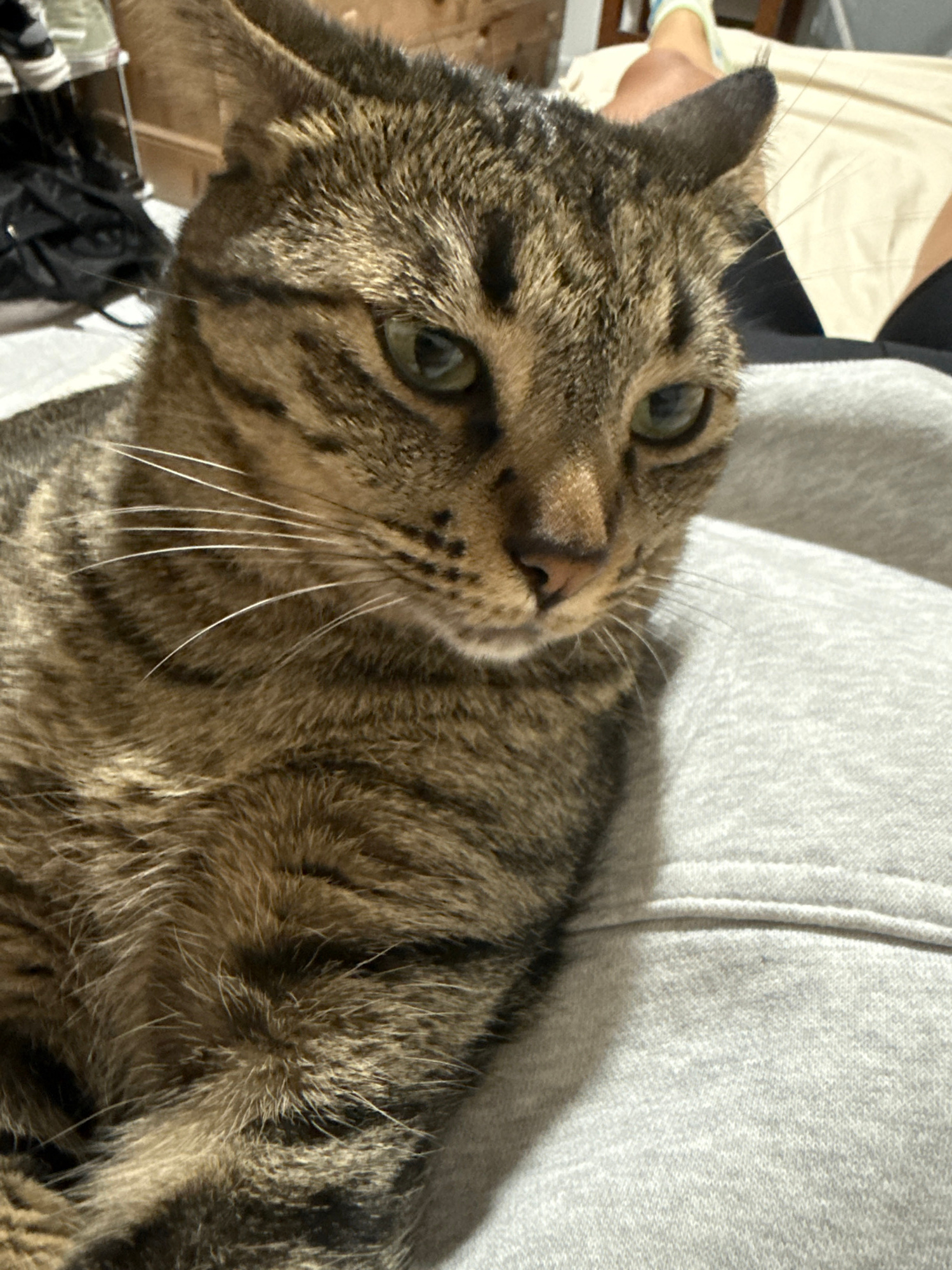 A tabby cat rests on a gray, soft surface, likely clothing. The cat's head is tilted to the side, with its eyes open and focused. Its fur displays a pattern of brown and black stripes. Long, white whi…read more