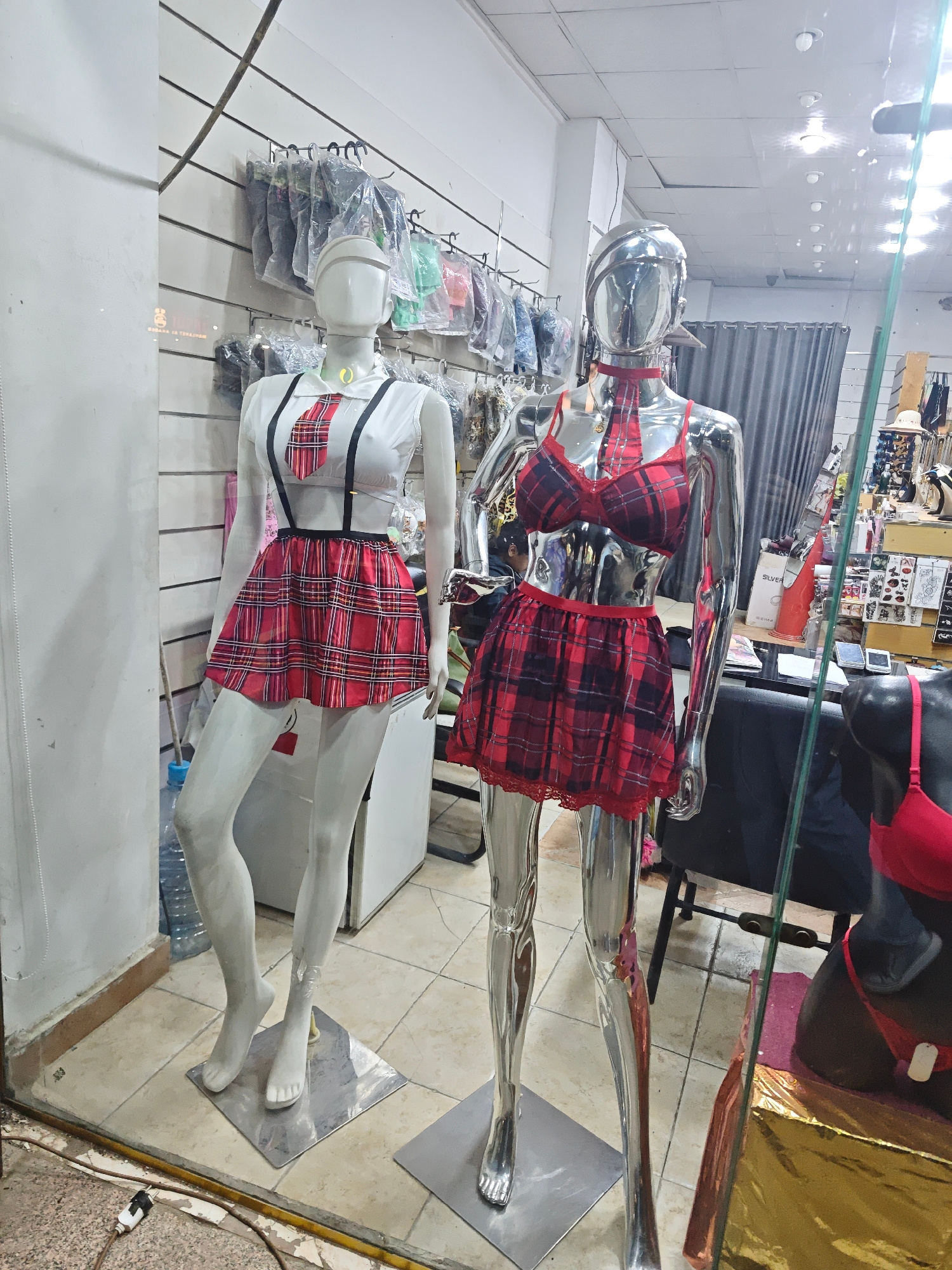 The image shows two mannequins in the window of a shop in Hurghada, Egypt. The mannequin on the left is white and wears a white top with black suspenders, a red and black plaid skirt, and a red plaid…read more