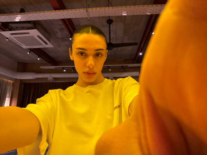 An indoor selfie shows a young adult female looking directly at the camera with a neutral expression. She has dark hair slicked back from her face and wears a loose-fitting, light yellow long-sleeved…read more