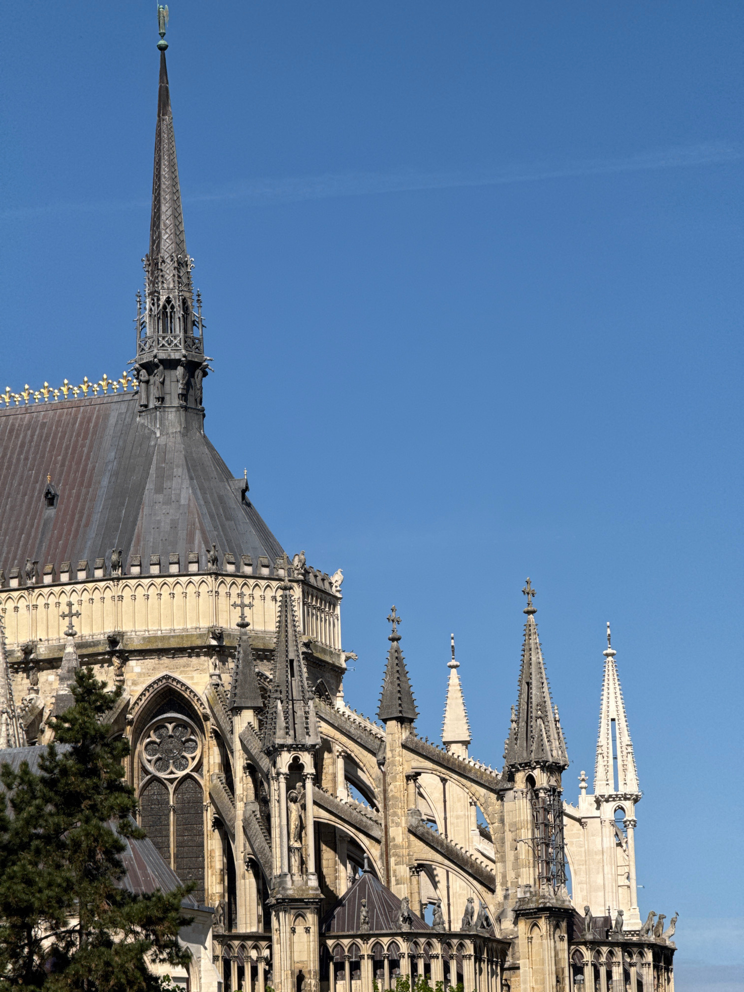 The image shows an exterior view of Reims Cathedral in Reims, France, looking up at the roof and spires against a clear blue sky. The cathedral's Gothic architecture is visible, including the intricat…read more