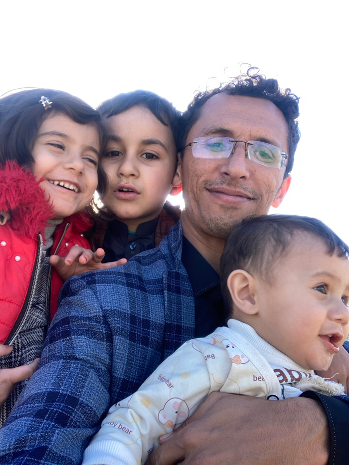 A group selfie features four individuals: one adult male, two children (one girl, one boy), and one infant, positioned closely together against a bright, undifferentiated white background, precluding…read more