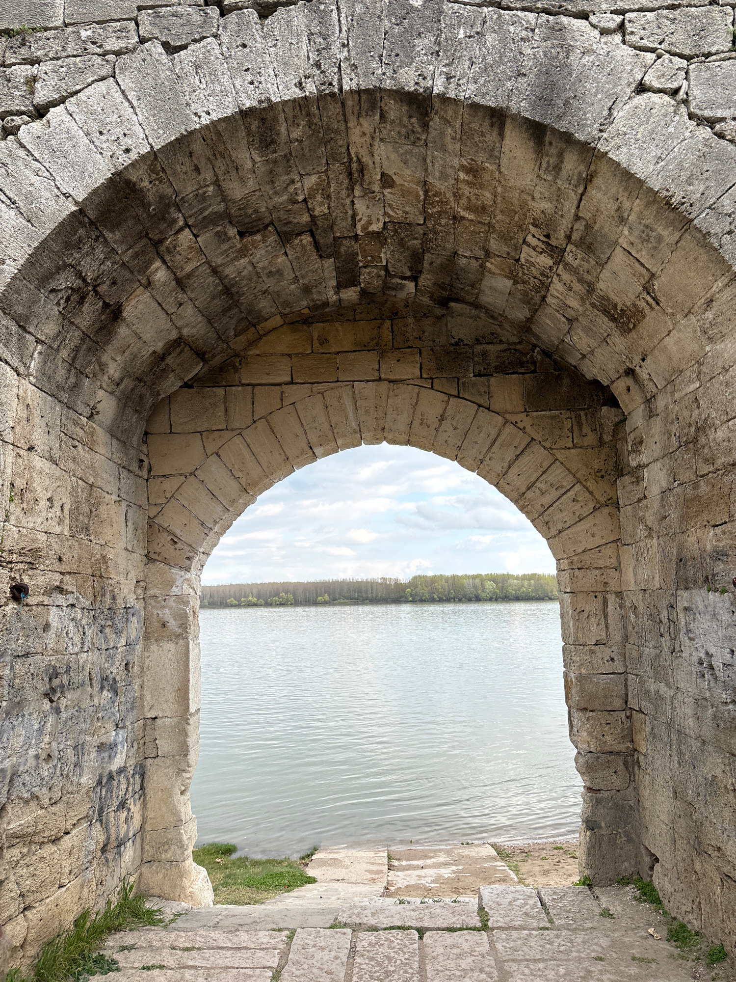 The image shows a view through a stone archway and a rectangular opening, likely part of a historical structure in Vidin, Bulgaria. The archway on the left is constructed from roughly hewn stone block…read more