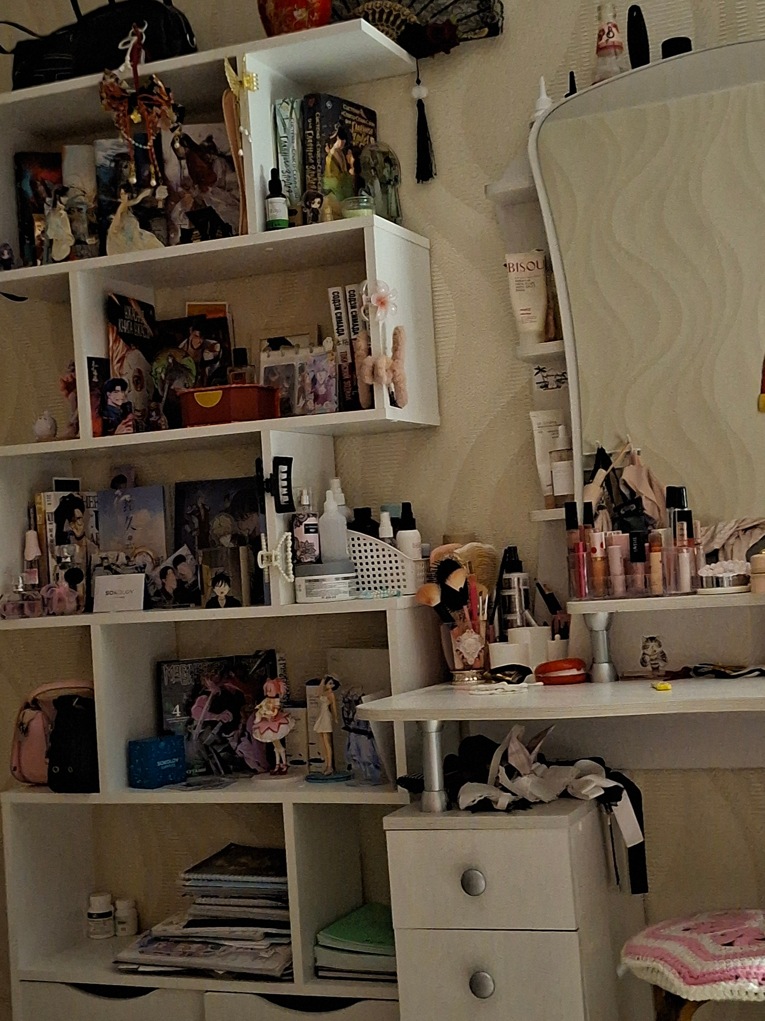 The image displays a densely packed multi-shelf unit and an adjacent vanity area, likely situated in a bedroom or dressing room in Chaikovsky, Russia. The scene appears inverted, with items placed on…read more