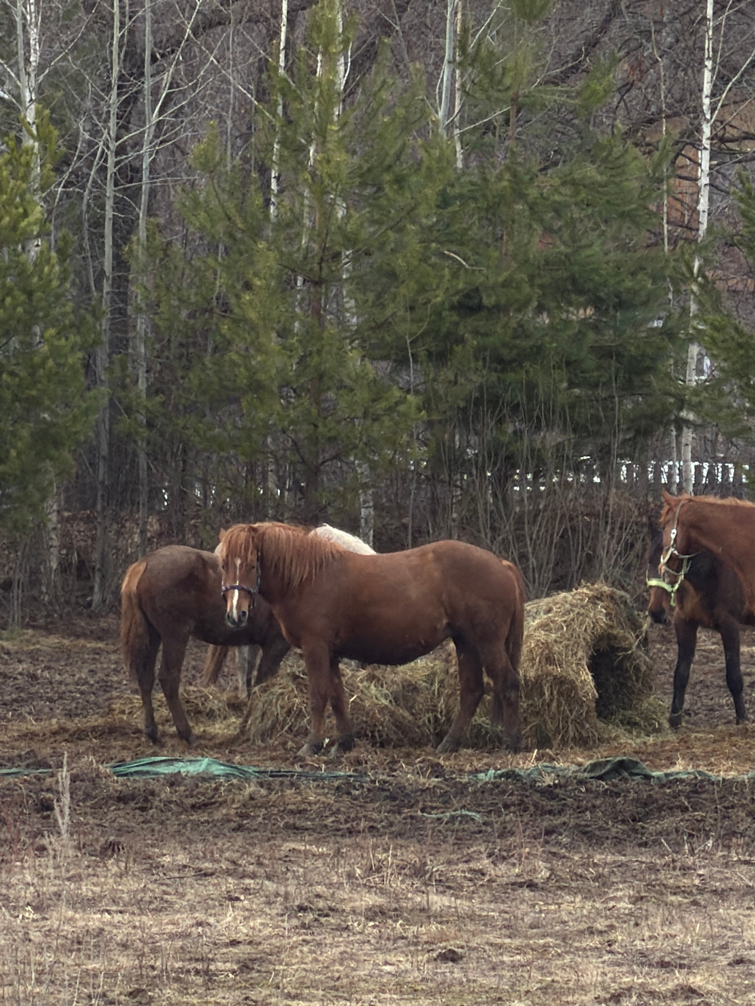 The image depicts three brown horses in a field adjacent to a wooded area with bare trees and evergreens. The horses are positioned near what appears to be a large bale of hay, possibly eating. One ho…read more