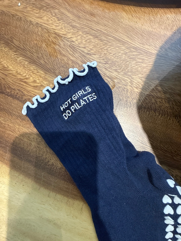 A single navy blue, ribbed sock is depicted resting on a wooden surface in Dubai, United Arab Emirates. The sock features a light blue ruffled cuff at its opening. White embroidered text on the upper…read more