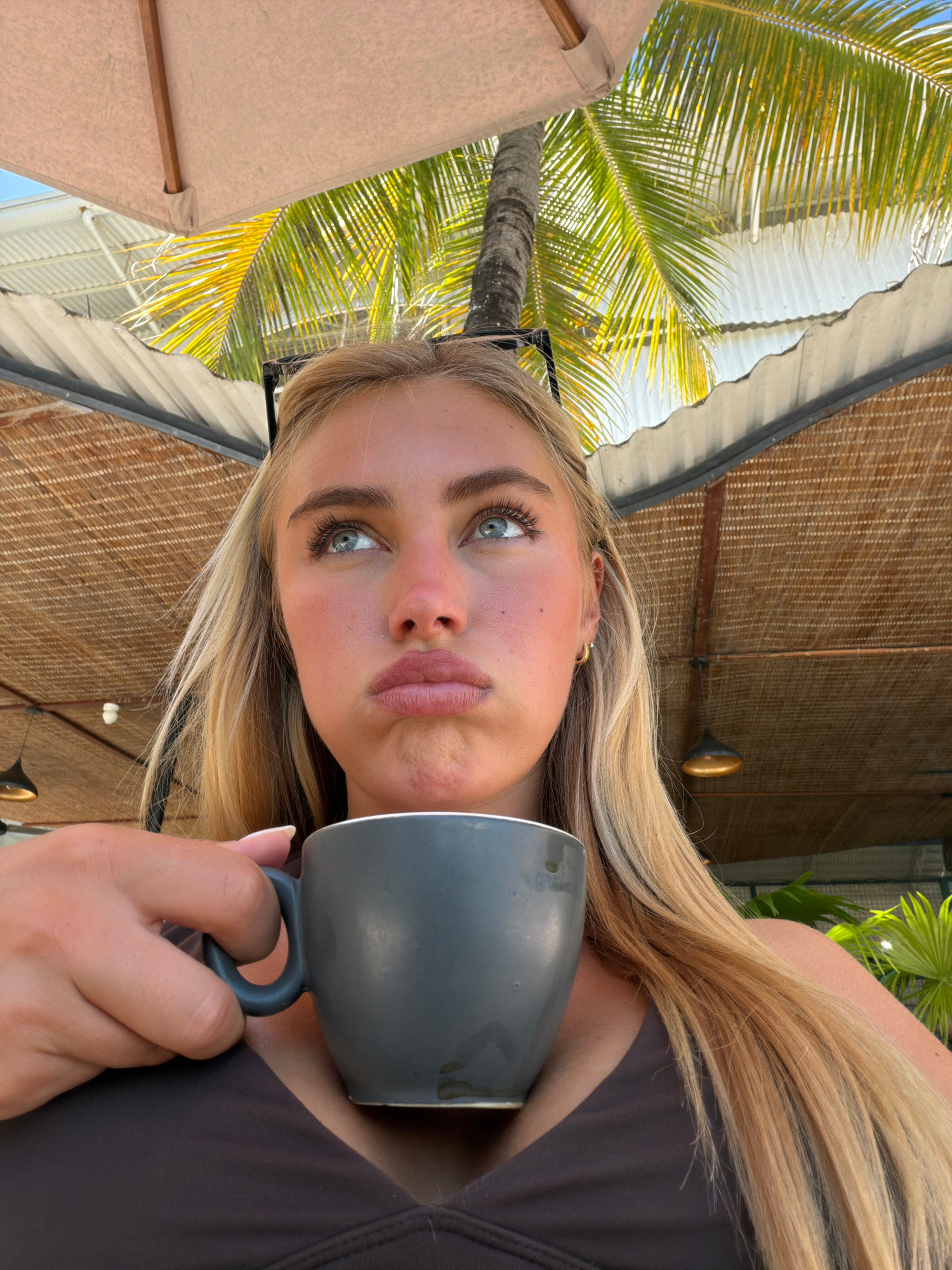 A young, fair-skinned woman with blonde hair and light eyes holds a gray mug. She is outdoors, with palm trees and a woven wooden structure visible in the background. This is North Kuta, Indonesia.