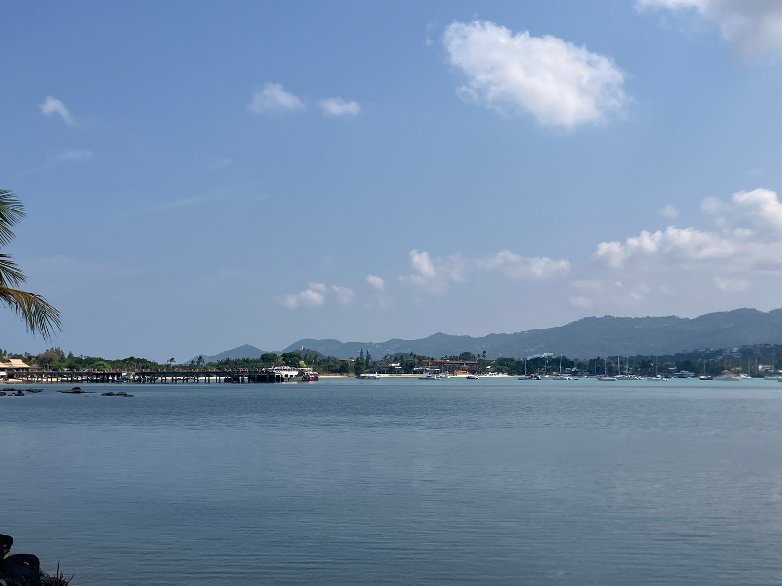 This wide-angle photograph presents a tranquil coastal landscape in Baan Plai Laem, Thailand, under a bright, clear blue sky with scattered white, cumulus clouds. The foreground is dominated by a calm…read more