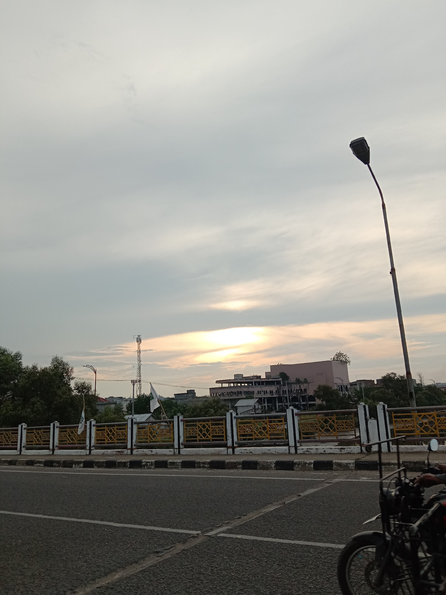 The image shows a street scene at sunset in Lhokseumawe, Indonesia. The viewpoint is from a bridge with a yellow and white decorative railing. A two-lane road is in the foreground with a motorcycle pa…read more