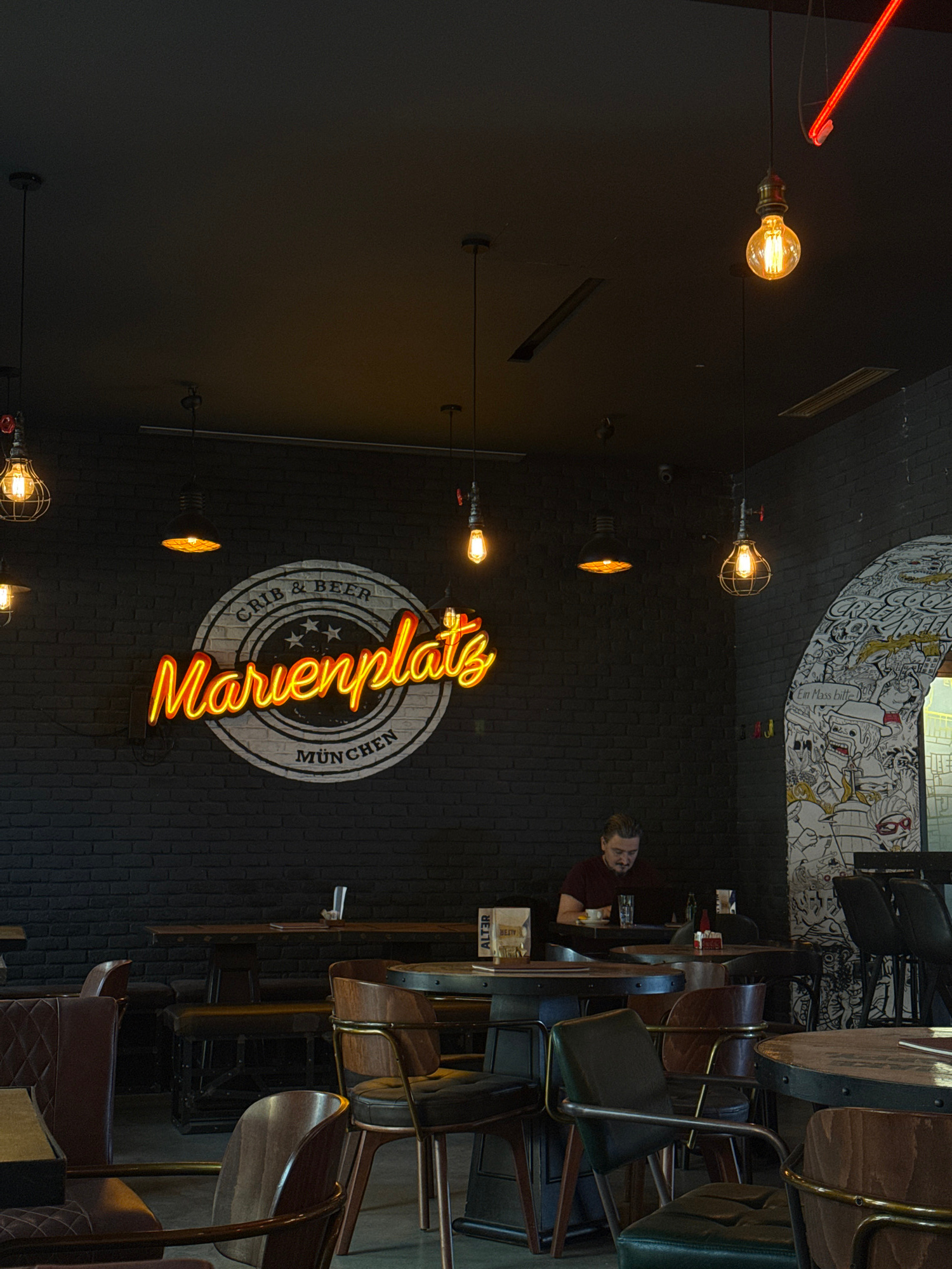 The image captures the interior of a dimly lit bar or restaurant, showcasing a blend of industrial and themed decor. The scene is dominated by dark brick walls and ceiling, from which several exposed…read more