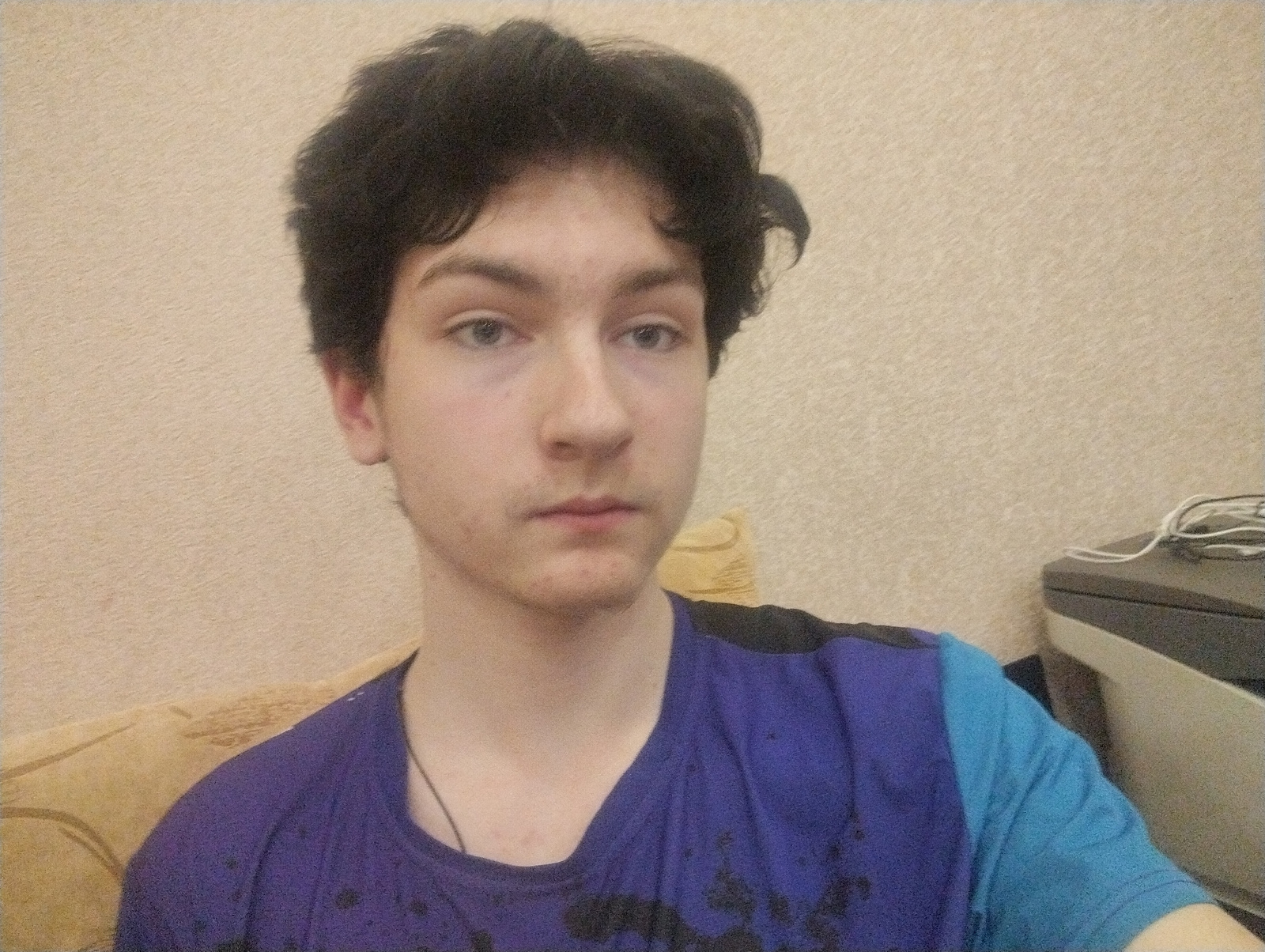 A close-up, slightly grainy photograph depicts a young, light-skinned person with dark, wavy hair and blue-gray eyes. The person appears to be male, wearing a purple and blue t-shirt. The background s…read more