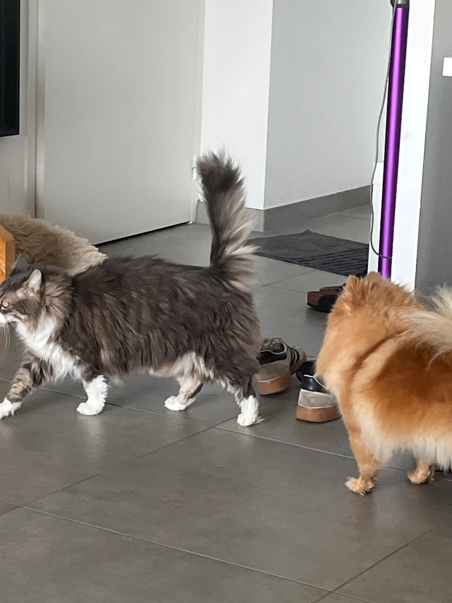 The image shows an indoor scene, rotated 90 degrees clockwise. In the lower half of the frame, a fluffy, long-haired cat with grey, white, and tabby markings walks across a dark grey tiled floor. The…read more