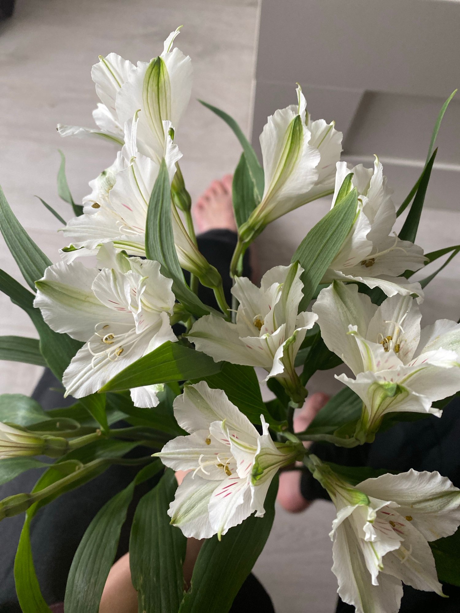 A high-angle, close-up shot shows a cluster of white Alstroemeria flowers with green leaves. The petals are predominantly white with subtle green tinges and delicate red striations inside. The flowers…read more