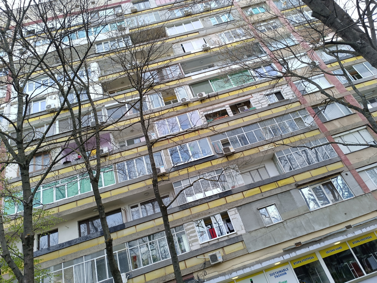 A low-angle shot shows the facade of a multi-story building, framed by trees with bare branches. The building has a repetitive pattern of windows, air conditioning units, and balconies, painted in alt…read more