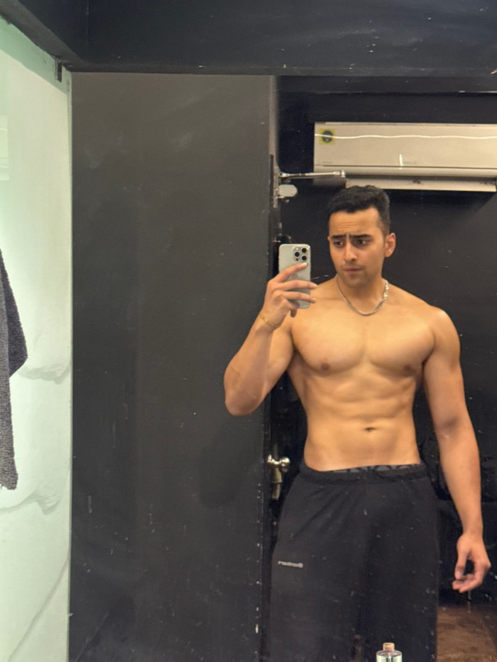 A man is taking a selfie in the mirror. He is shirtless, wearing dark athletic shorts, and a silver chain necklace. The man is tanned with short dark hair. He has a phone in his hand and is looking atβ¦read more