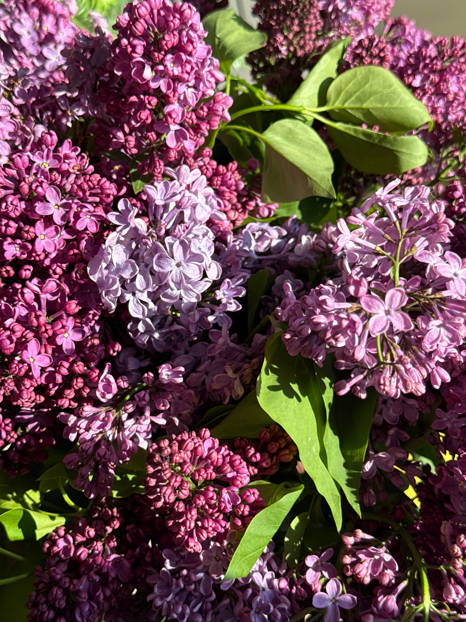 The image depicts a close-up view of a bouquet of lilacs with varied shades of purple. Green leaves are interspersed among the flowers. The location is not discernible from the image.