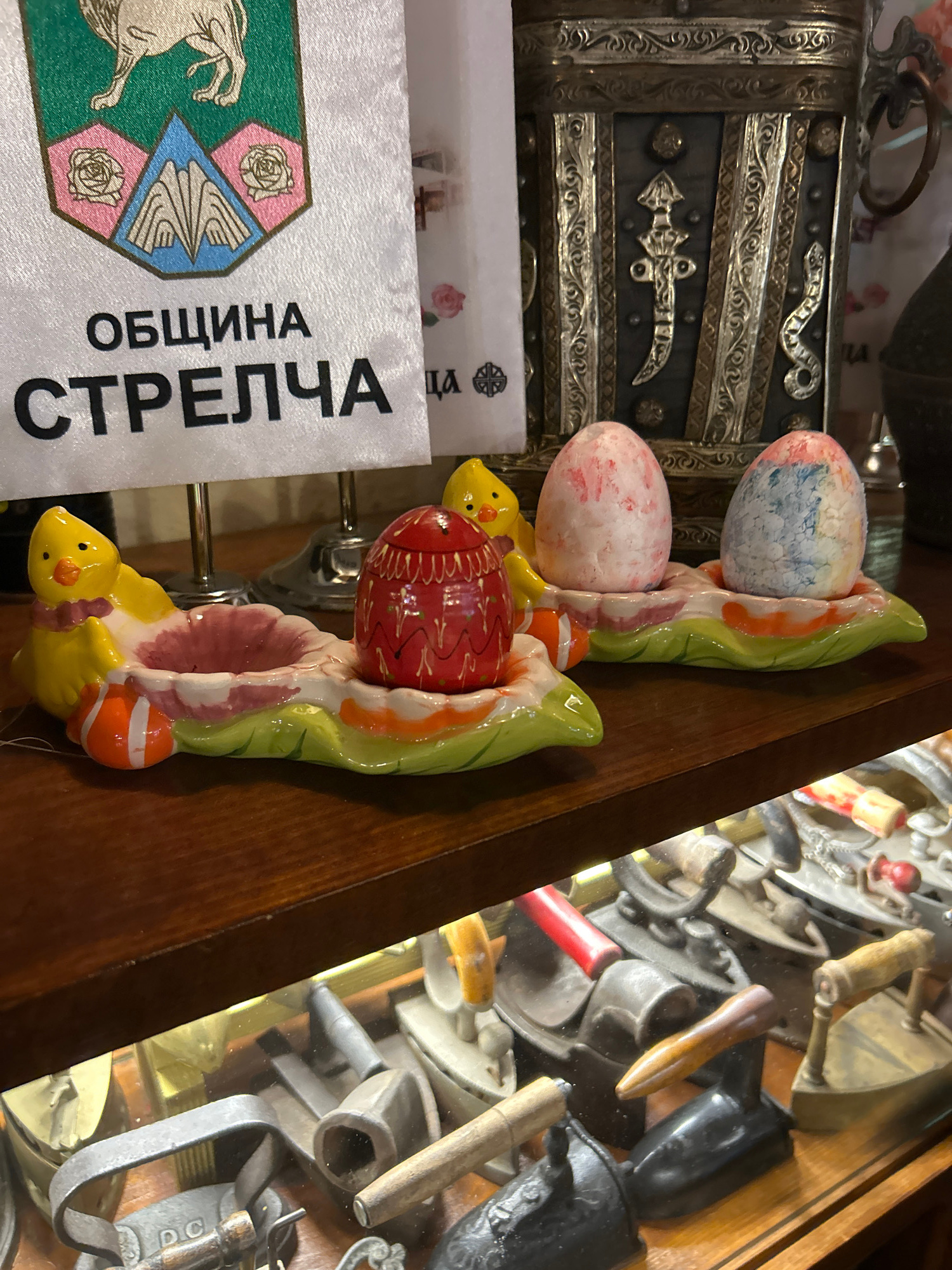 The image shows a close-up view of various objects. At the forefront, a sign with the text "ОБЩИНА СТРЕЛЧА" (Municipality of Strelcha), which is a town in Bulgaria, is visible. To the left of the sign…read more