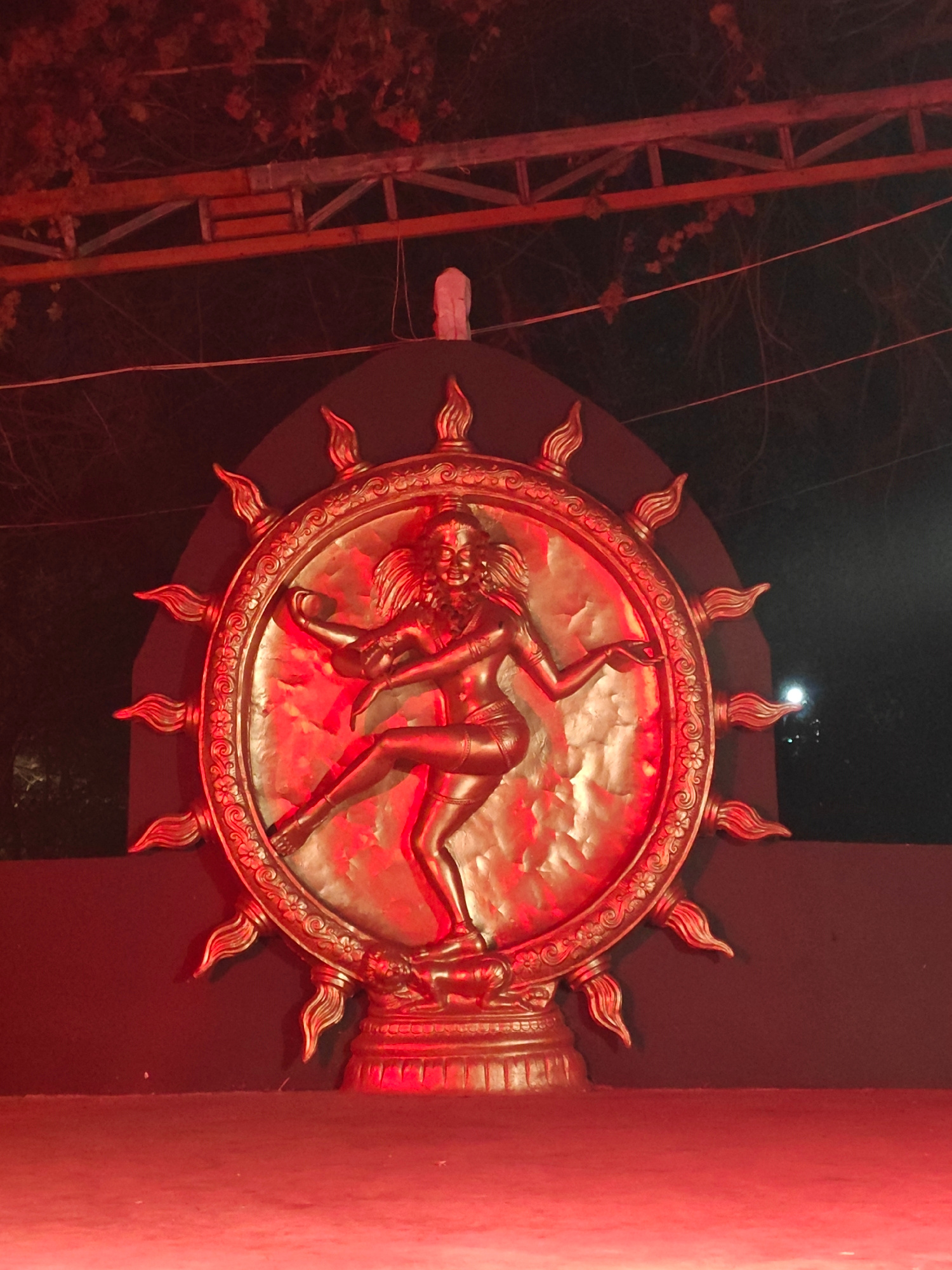 A close-up shot shows a statue of Nataraja, the dancing form of the Hindu god Shiva, bathed in red light. The statue, made of a golden metal, is mounted on a pedestal, and set against a dark backdrop.…read more