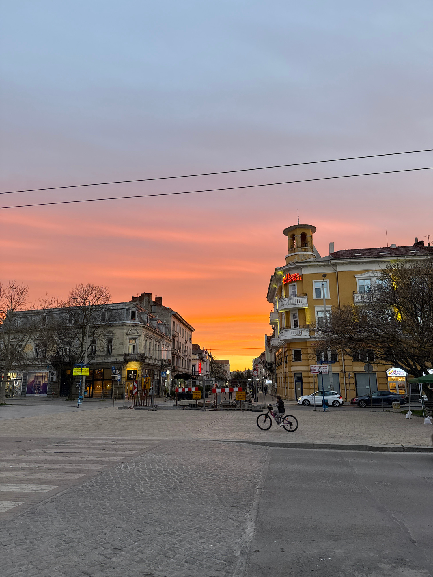 The image captures a street in Ruse, Bulgaria, at dusk or dawn, indicated by the orange and pink sky. On either side of the street stand several buildings. On the right is "Hotel Central" with a lit-u…read more