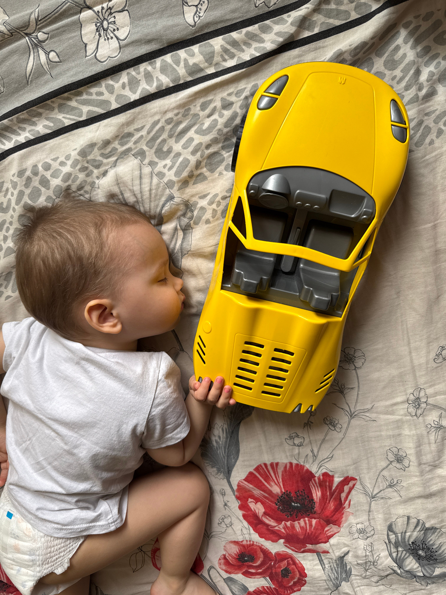 A child sleeps on a patterned bed sheet next to a yellow toy car. The child is wearing a diaper and a white t-shirt. The bed sheet has a floral pattern with red and gray flowers. The toy car is a conv…read more