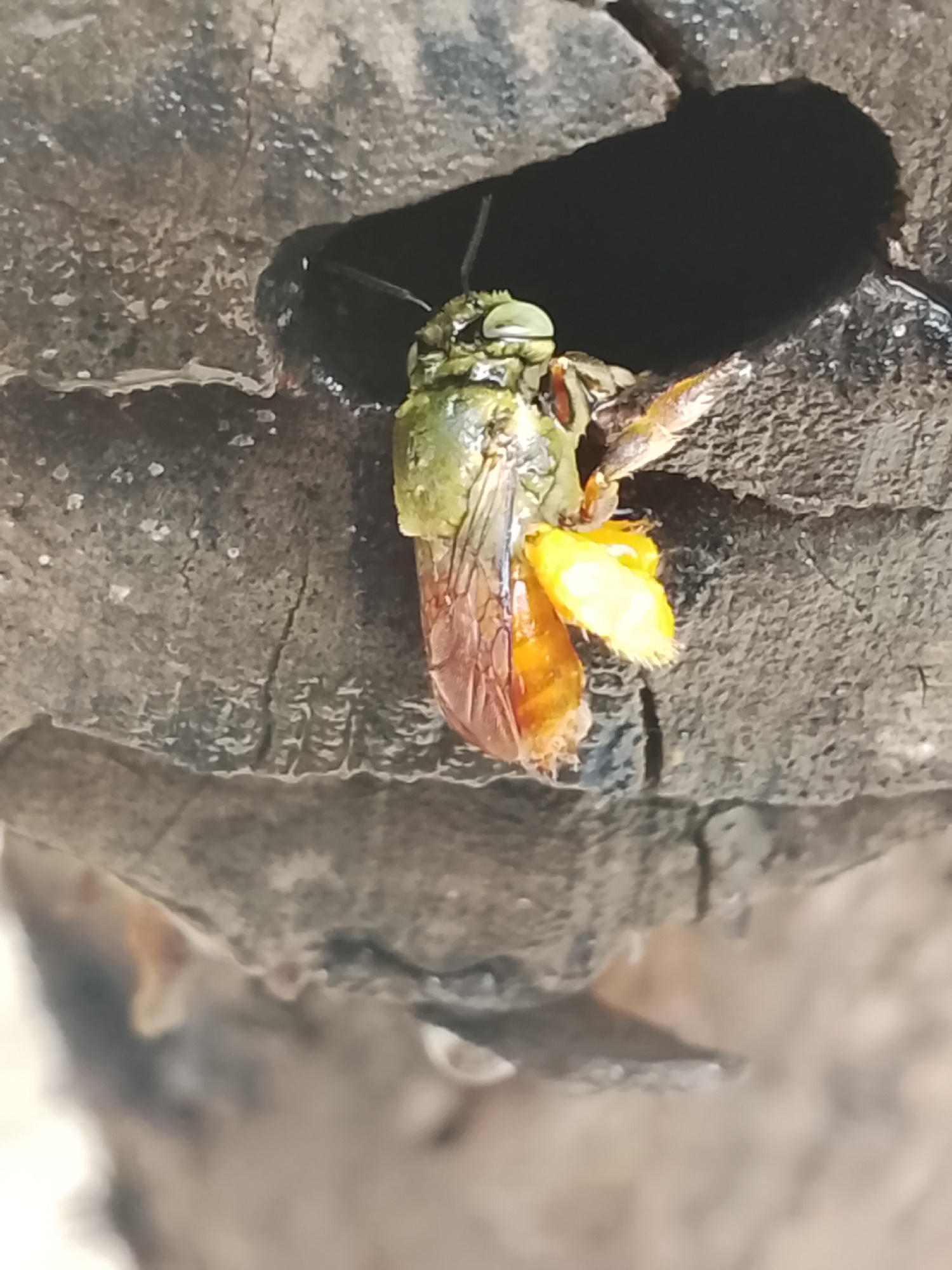 A close-up shows a green bee emerging from a dark hole in a weathered piece of wood. The bee is carrying a large, bright yellow mass, likely pollen, on one of its legs. The wood's surface appears roug…read more