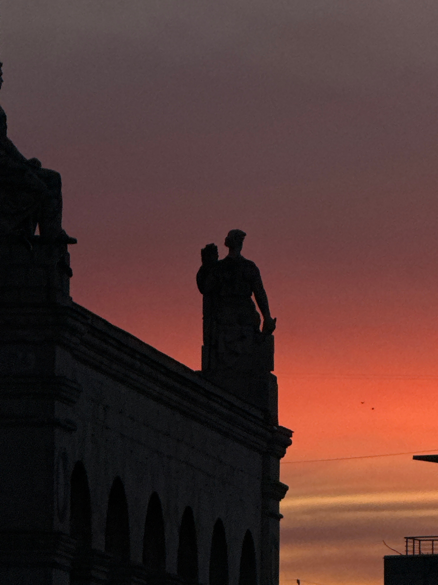 The image shows a silhouetted gargoyle on a building at sunset in Moscow, Russia. The sky transitions from dark grey to orange near the horizon. The gargoyle is positioned on the edge of the building,…read more