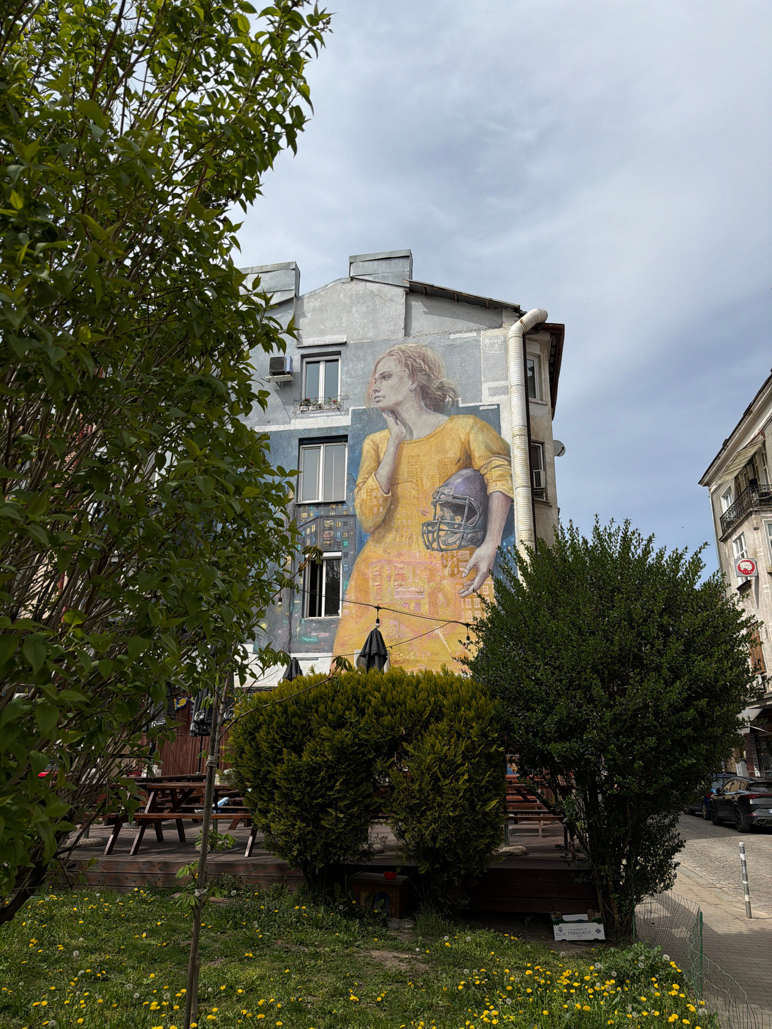 The image shows an outdoor scene in Sofia, Bulgaria. A multi-story building displays a large mural depicting a woman in a yellow garment holding an American football helmet. The mural is painted on th…read more