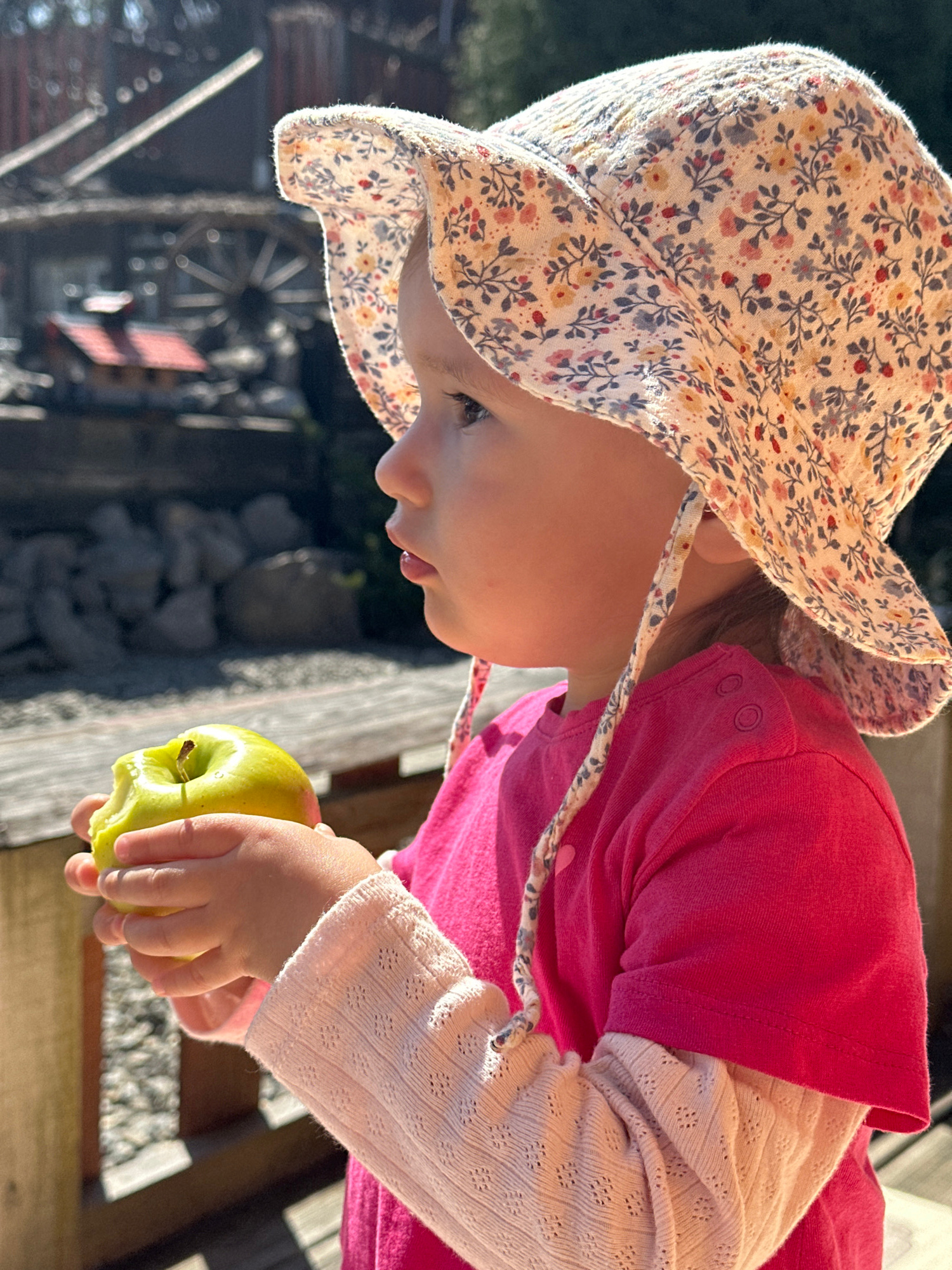 A young child wearing a floral hat and a pink shirt over a long-sleeved, lacy white shirt holds a partially eaten green apple. The child is outdoors, and the background suggests a rustic environment w…read more
