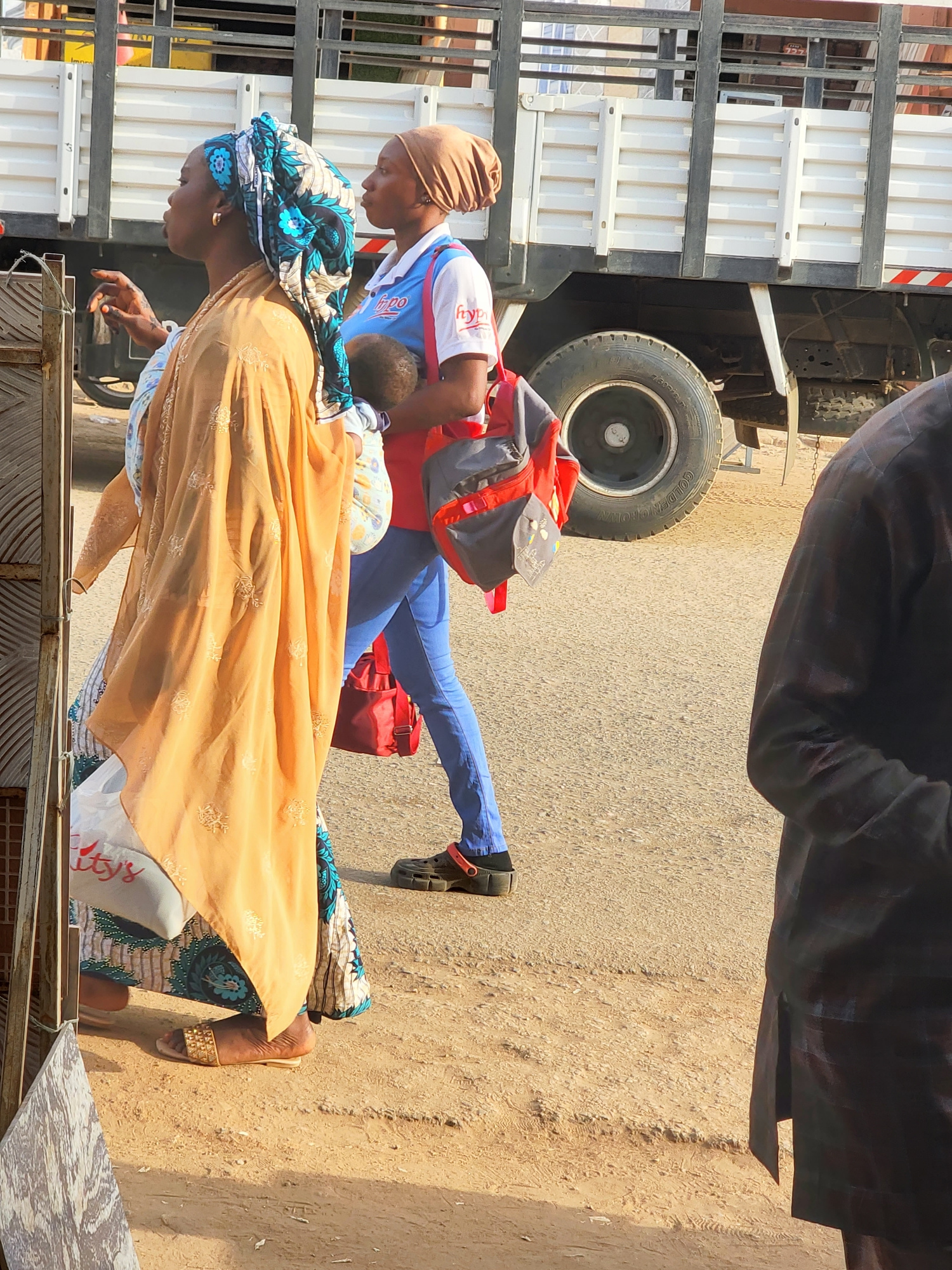 In Maiburiji, Nigeria, a woman in a blue and floral turban, an orange dress, and gold sandals stands near a truck. Another woman, wearing a tan head covering and a blue and white shirt, carries a chil…read more