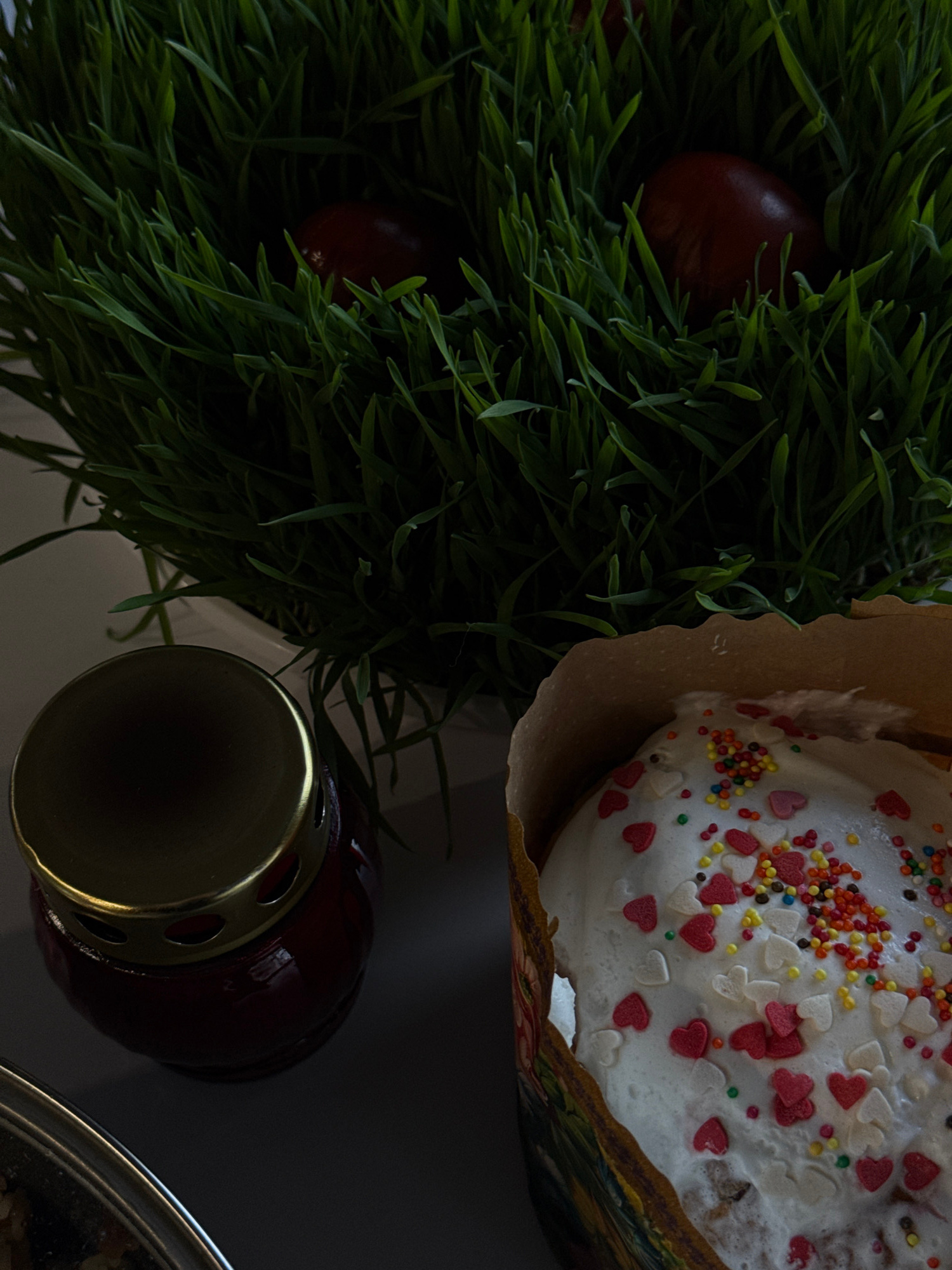 The image depicts an Easter still life. On the left, vibrant green grass conceals two red Easter eggs. Adjacent to the grass is a kulich, a traditional Easter bread, topped with white icing and decora…read more