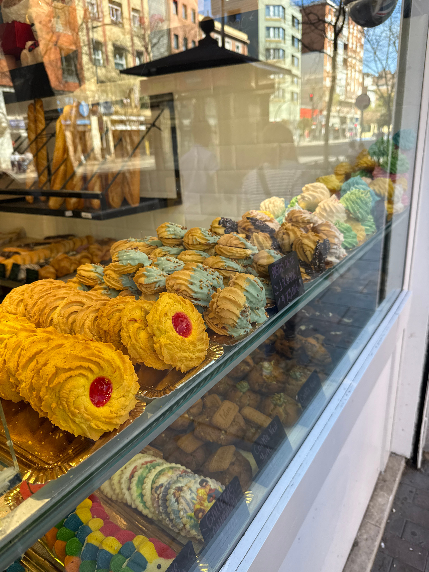 A display case in Madrid, Spain, showcases an assortment of cookies and pastries. The case contains rows of meringue-style cookies in various colors (green, white, blue) with chocolate drizzle, cookie…read more