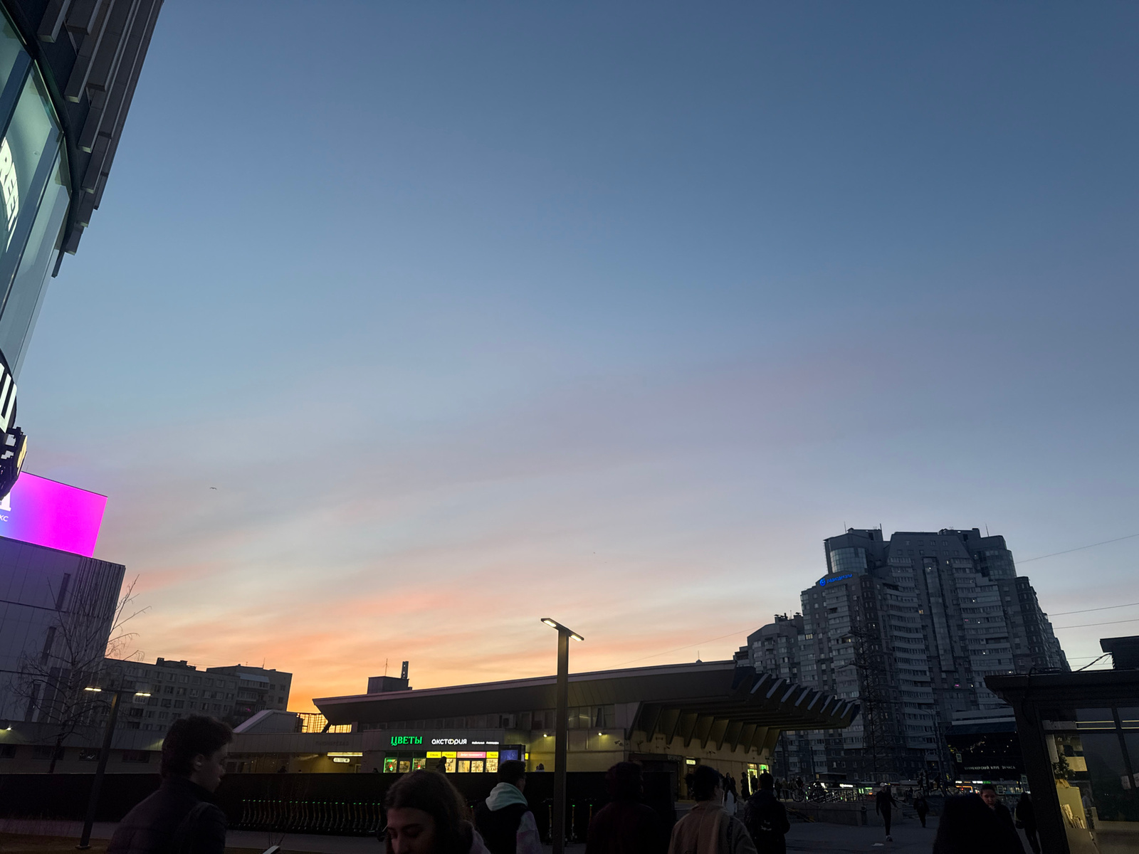 This image captures an urban street scene in Saint Petersburg, Russia, at dusk or early evening. The sky displays a beautiful gradient, shifting from a deep blue at the zenith to soft orange and pink…read more