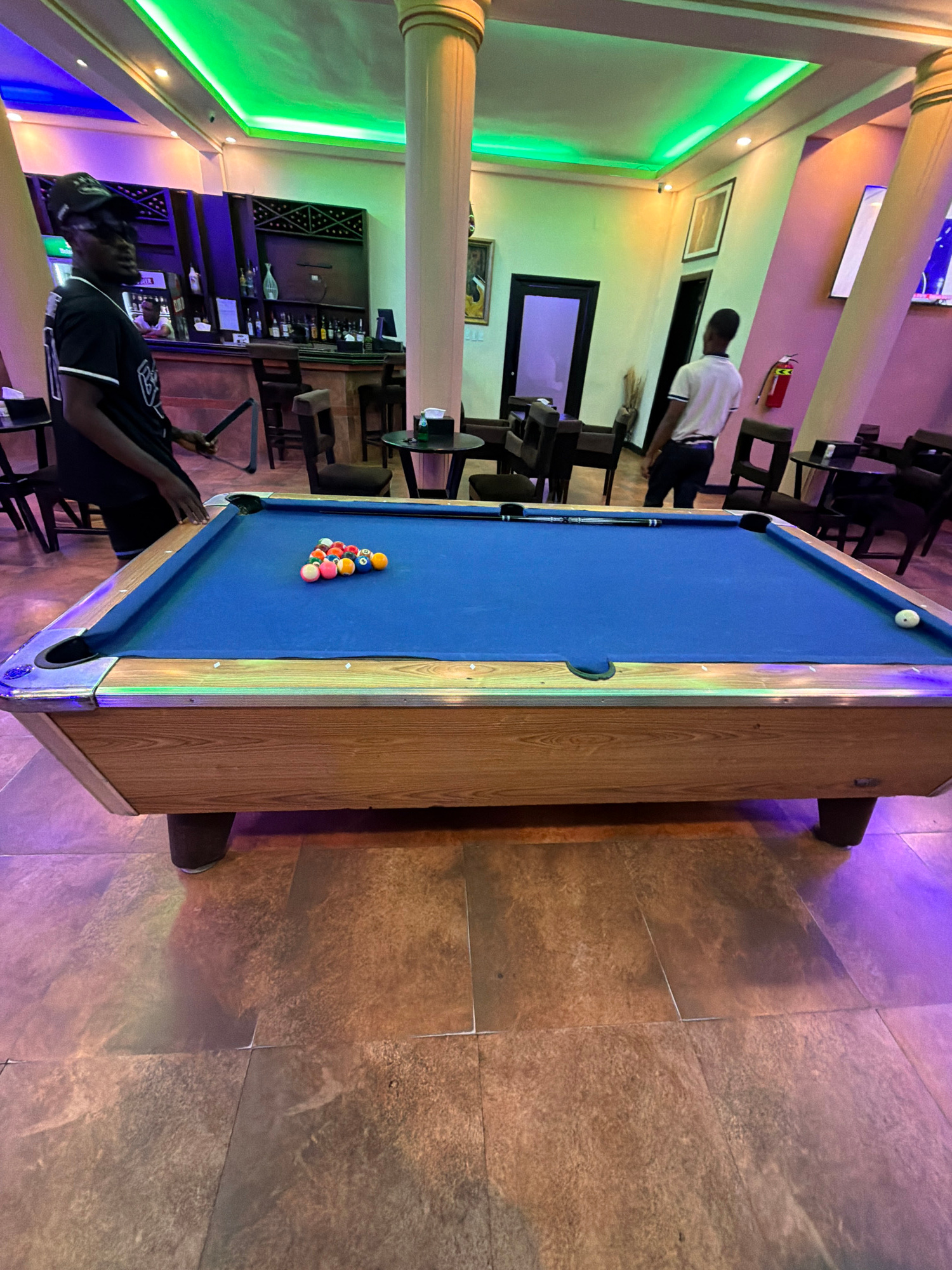 The image shows a pool table in what appears to be a bar or lounge. The table is set up with a rack of balls, ready for a game. A man is sitting at one end of the table, holding a pool cue, seemingly…read more
